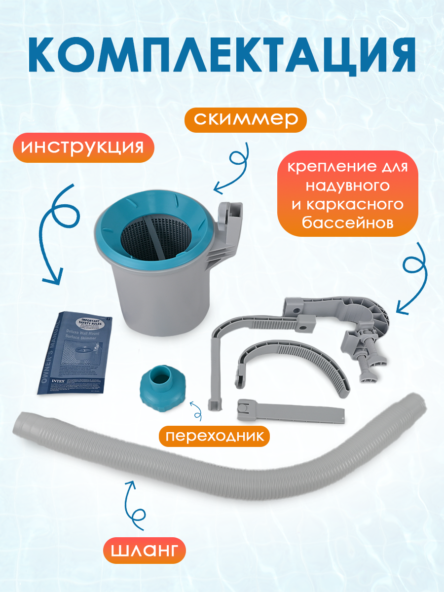 | Комплектация | навесной скиммер для бассейна INTEX, два крепления для надувных бассейнов и для каркасных бассейнов, фирменная упаковка |