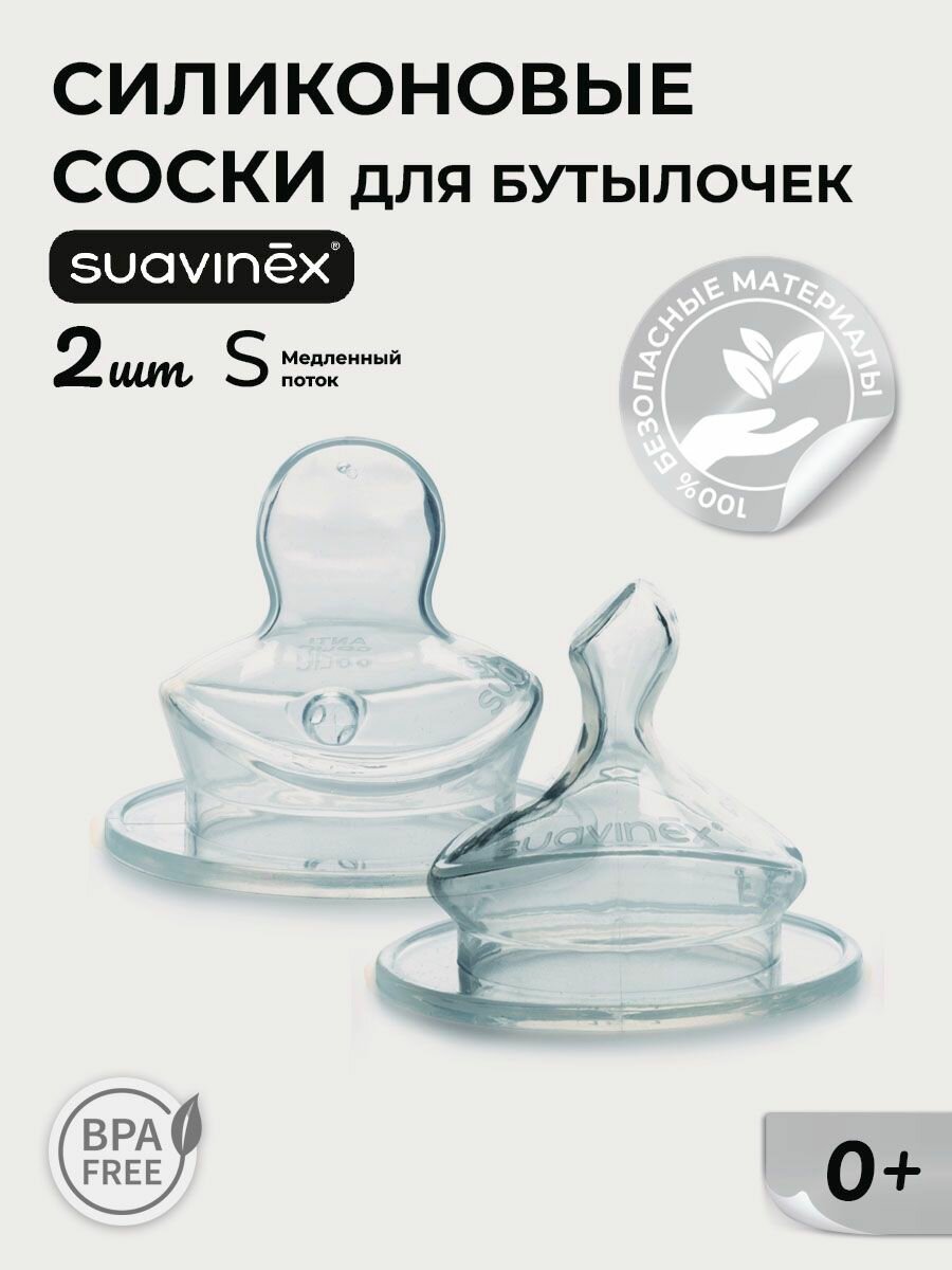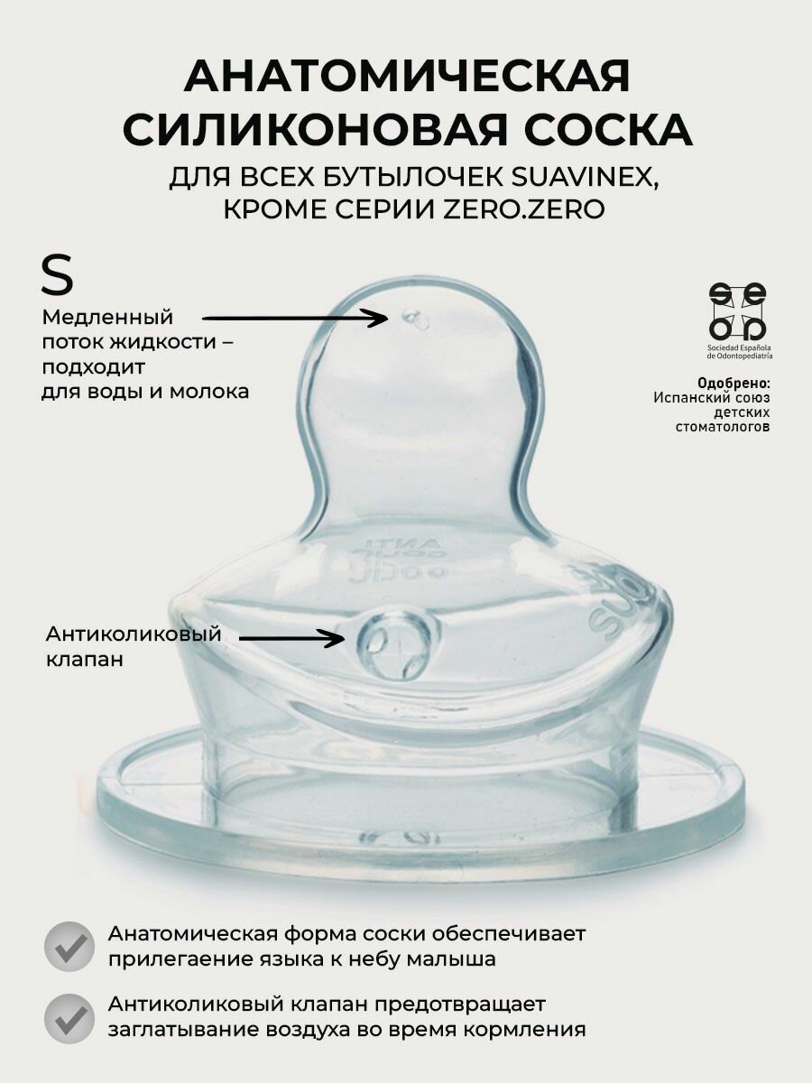 Набор (2 шт) силиконовых анатомических сосок для бутылочки Suavinex, от 0 до 6 мес. размер S интересное: