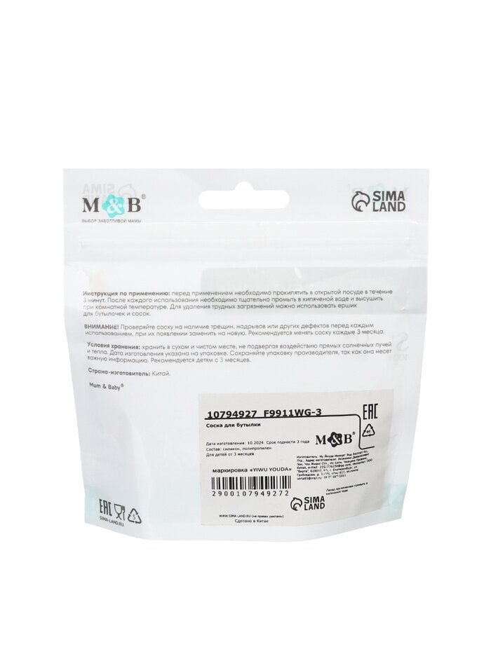Купить 18 шт. Соска для бутылочки силиконовой M&B, антиколиковая, +3мес, ШГ Ø70мм.
