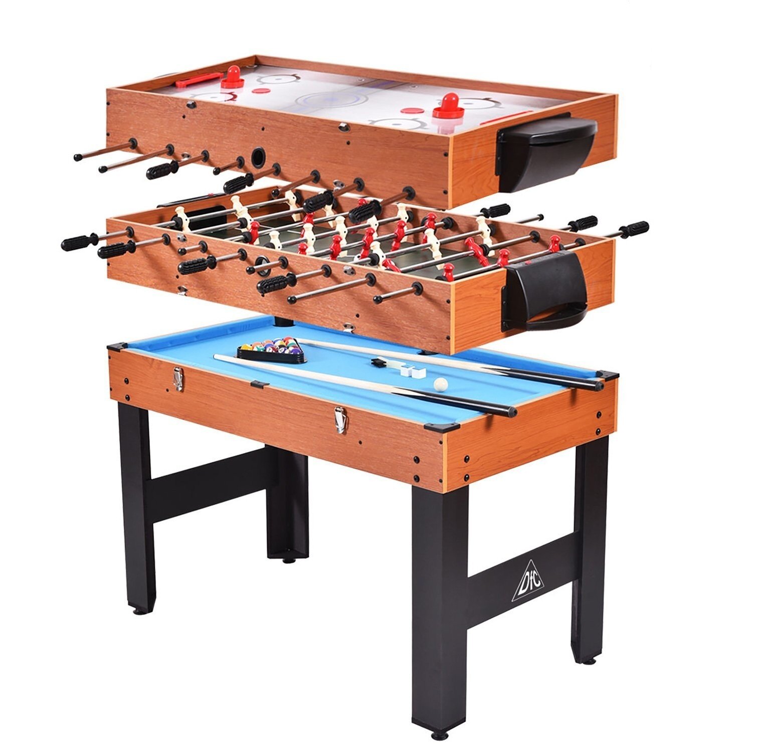 | Подробная комплектация | бильярд (пул): 2 кия (89 см), 16 шаров (31 мм), треугольник, мел, щетка; соккер: 2 мяча (32 мм), 13 белых игроков и 13 красных; хоккей: 2 биты, 2 шайбы |