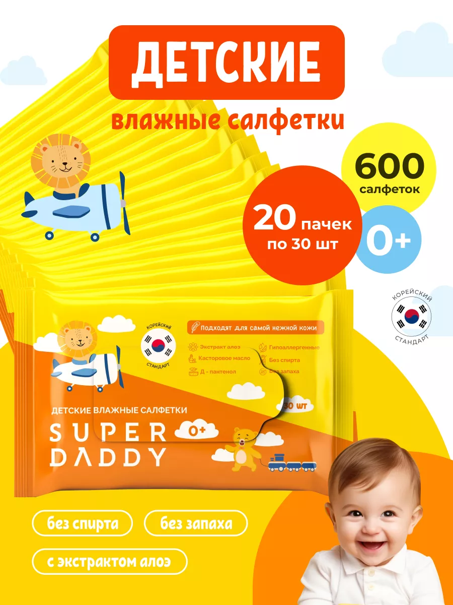Купить Салфетки влажные детские Super Daddy, с Д-Пантенолом и экстрактом алоэ, 600 штук, гипоаллергенные