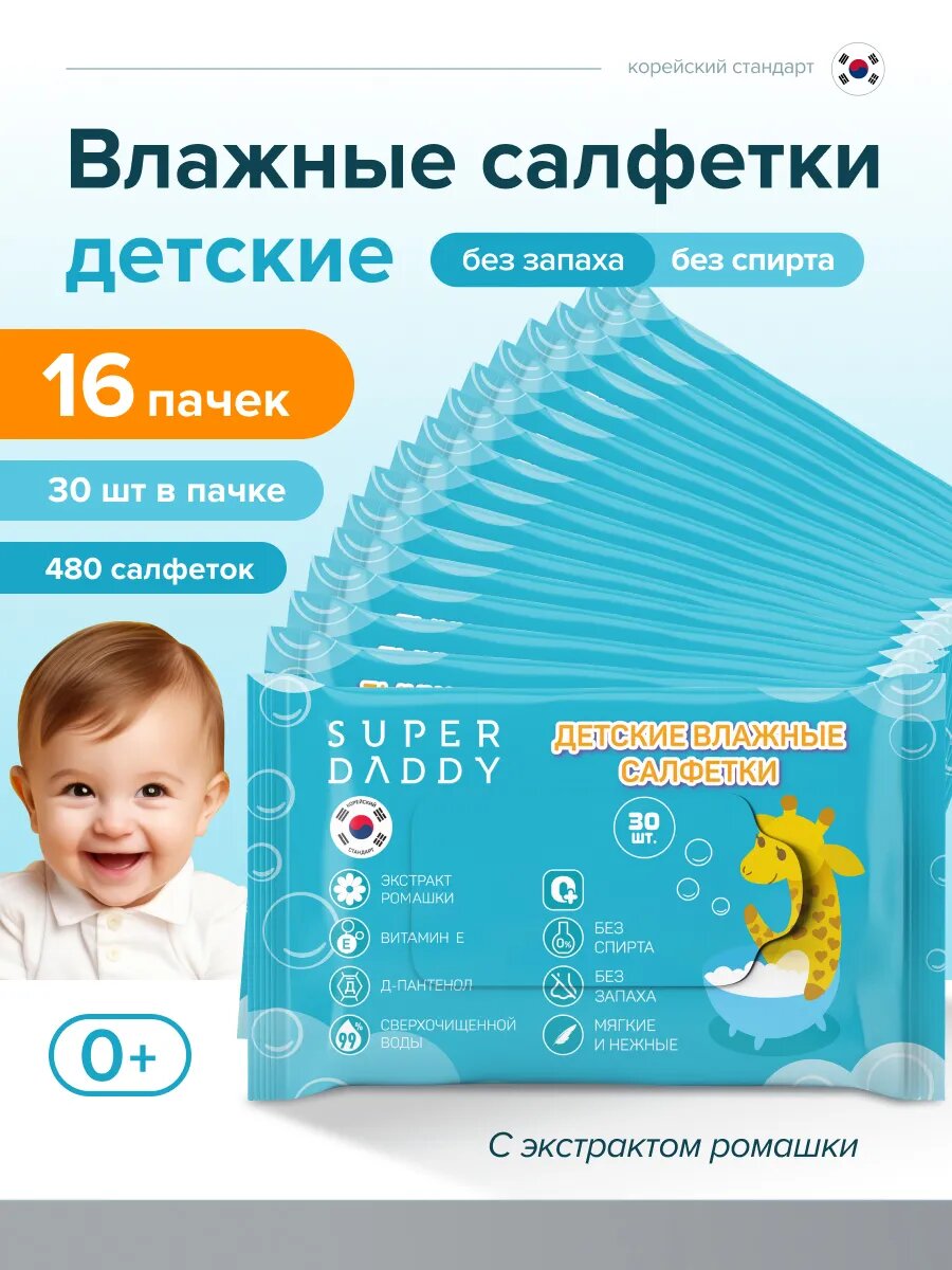 Салфетки влажные детские Super Daddy, с Д-Пантенолом и экстрактом алоэ, гипоаллергенные 480 штук