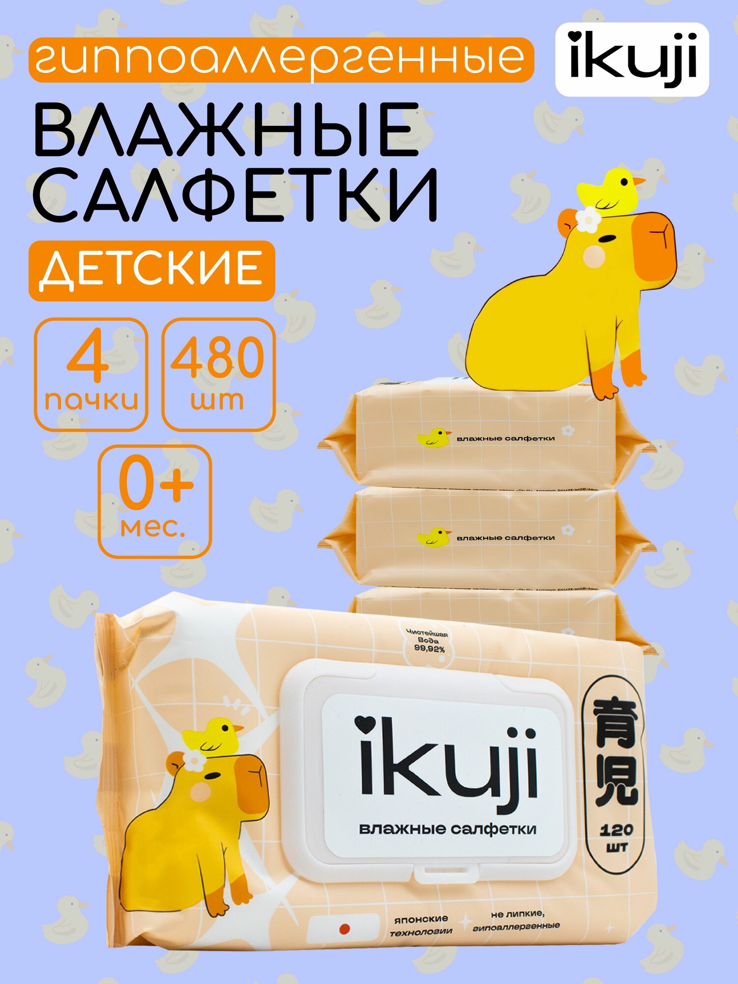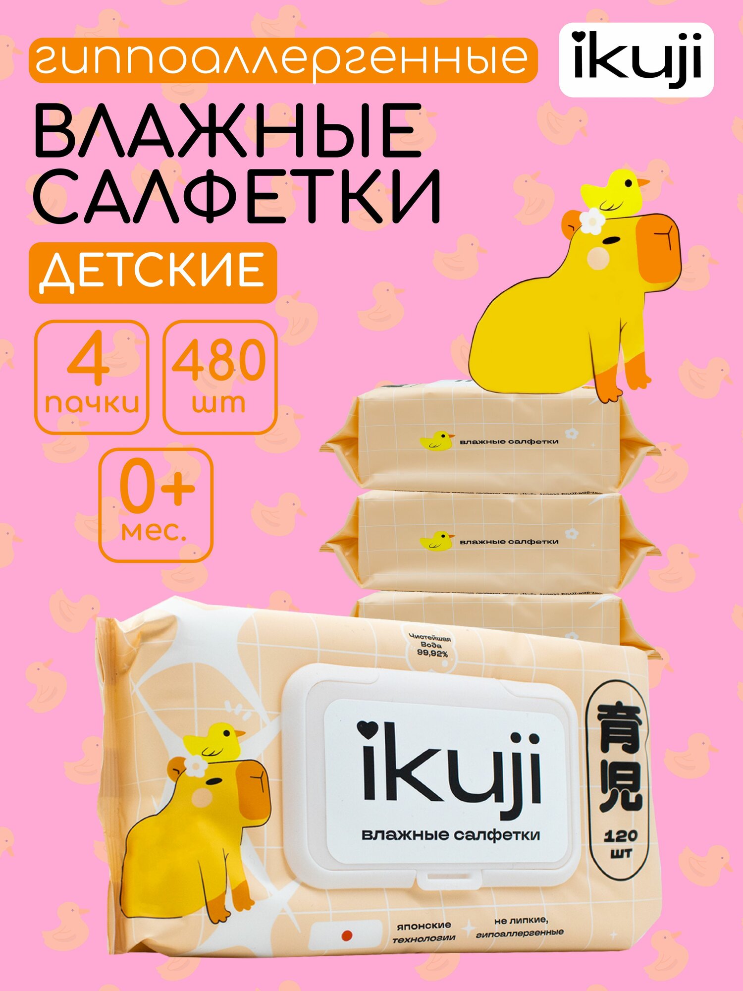 Детские влажные салфетки 480 шт. (4 упаковки по 120 шт.) IKUJI гипоаллергенные (99% вода) интересное:
