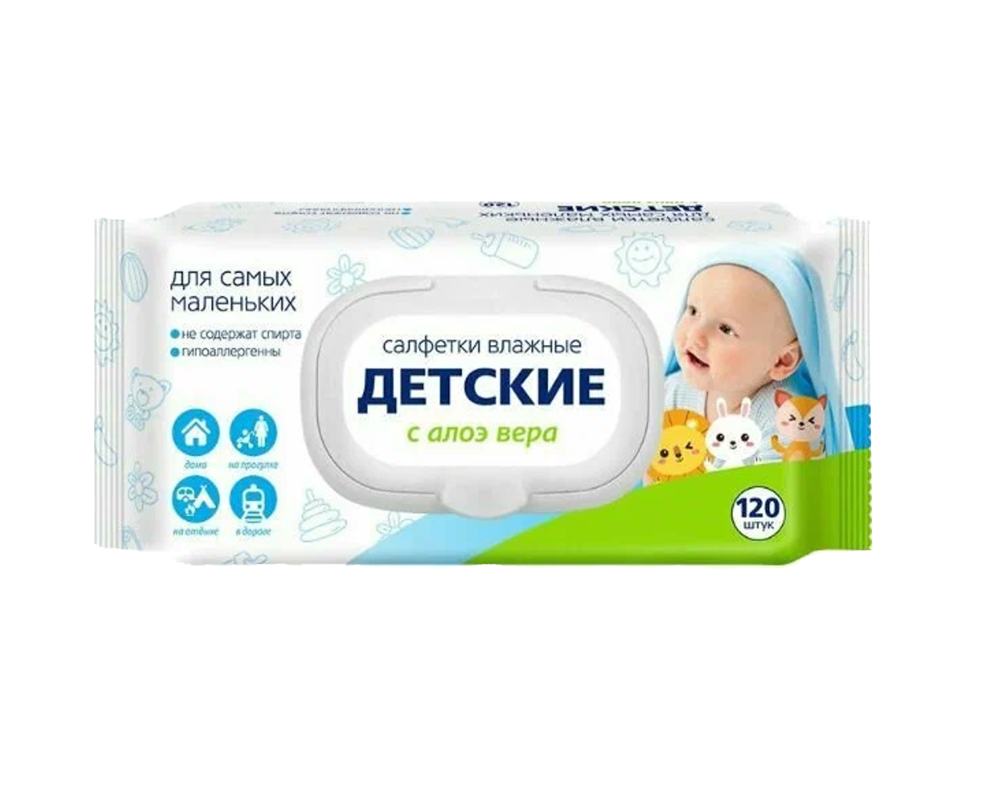 Салфетки влажные детские с алоэ вера 120 шт в пачке, 12 упаковок