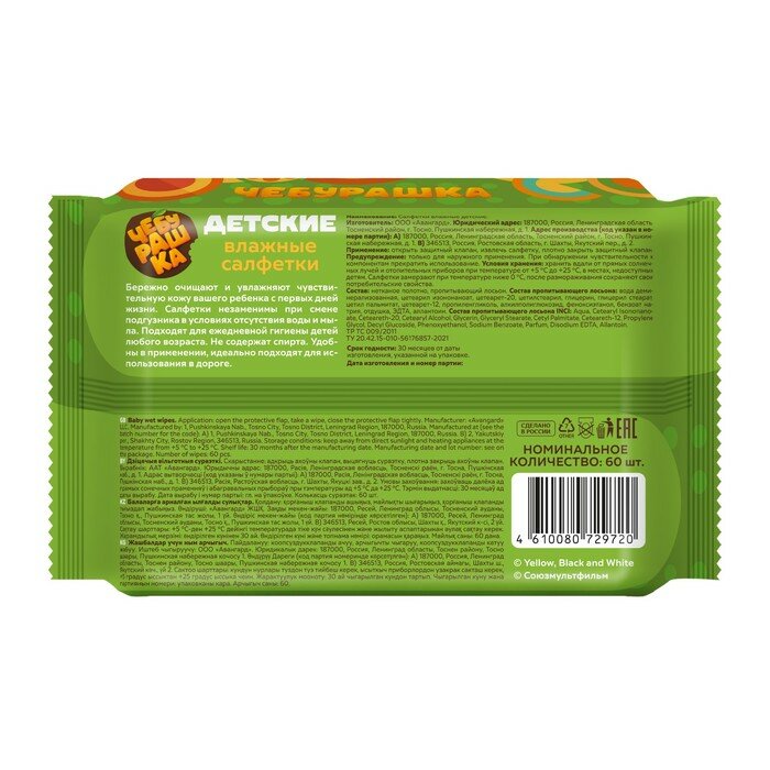 Влажные салфетки детские Чебурашка, 60 штук цвет микс интересное: