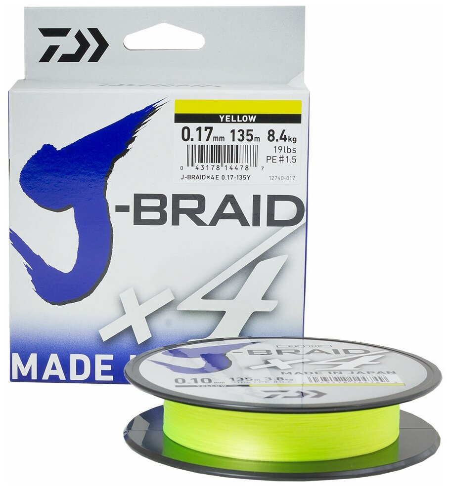 Плетеный шнур для рыбалки Daiwa J-Braid x4 желтый 135 метров 0.21 мм / плетенка для спиннинга