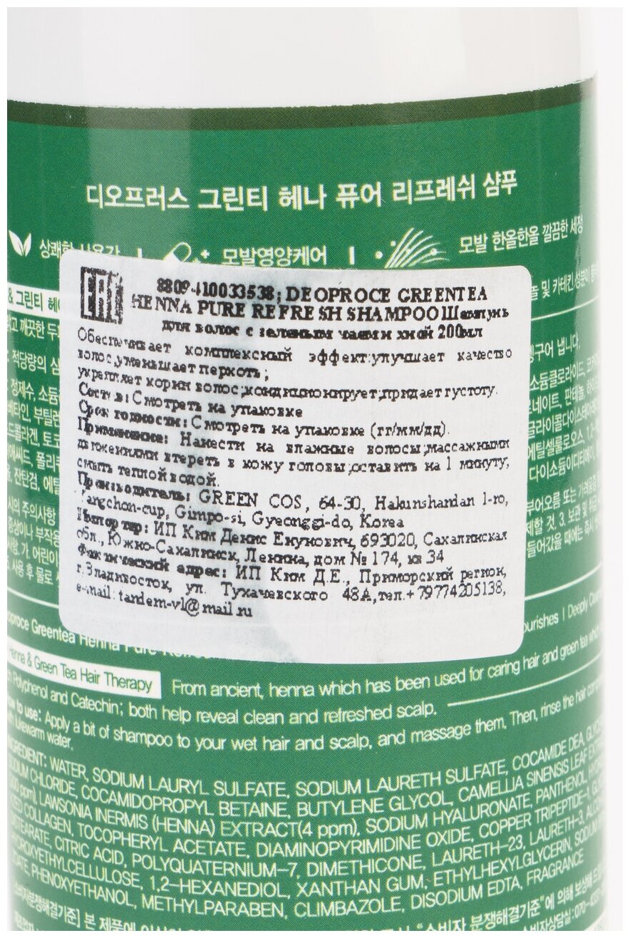 Купить Deoproce Смягчающий шампунь для волос с зеленым чаем и хной Green Tea Henna Pure Refresh Shampoo, 200 мл
