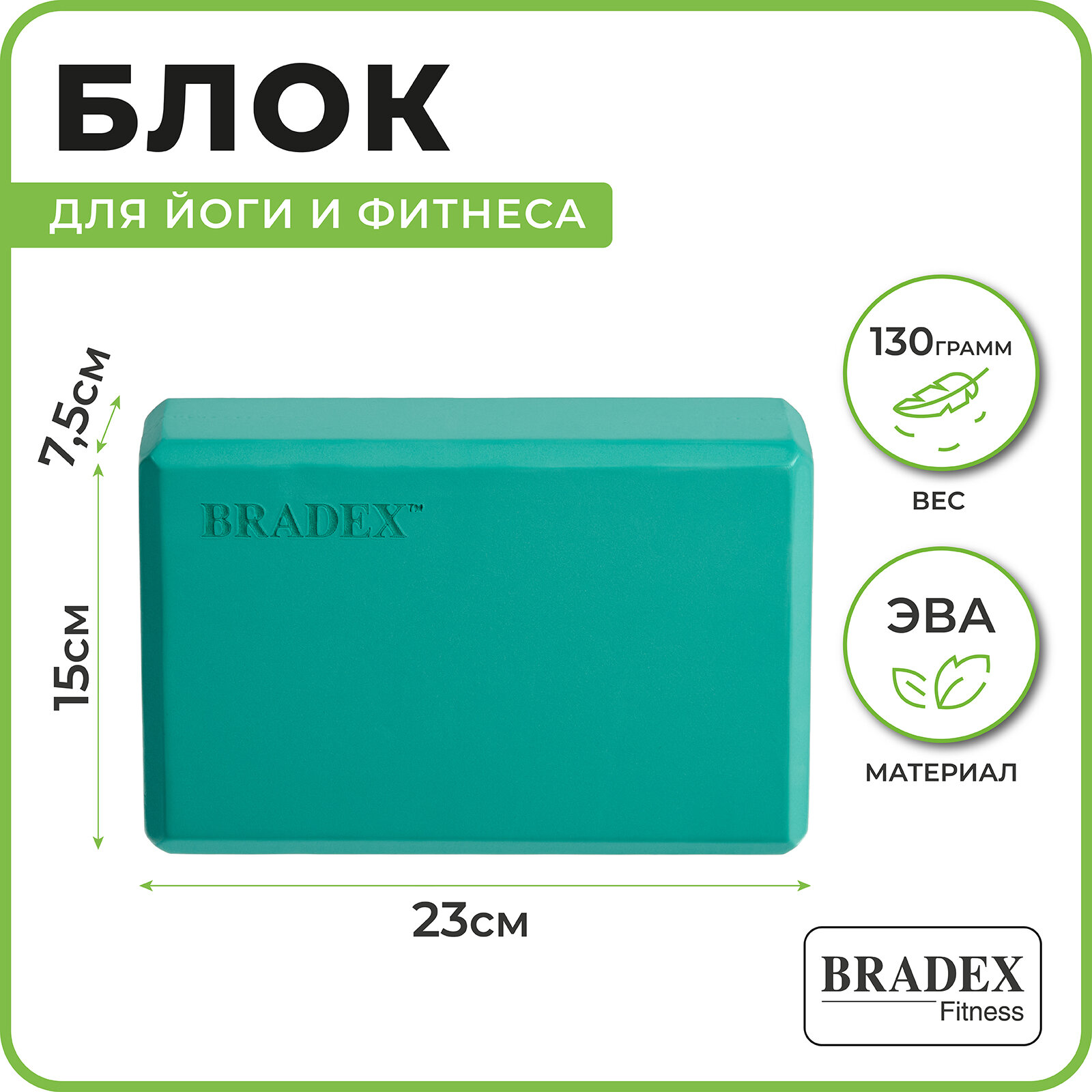 Блок для йоги Bradex пеноматериал 52кг/м3 ш.:150мм в.:230мм т.:75мм бирюзовый (SF 0408)