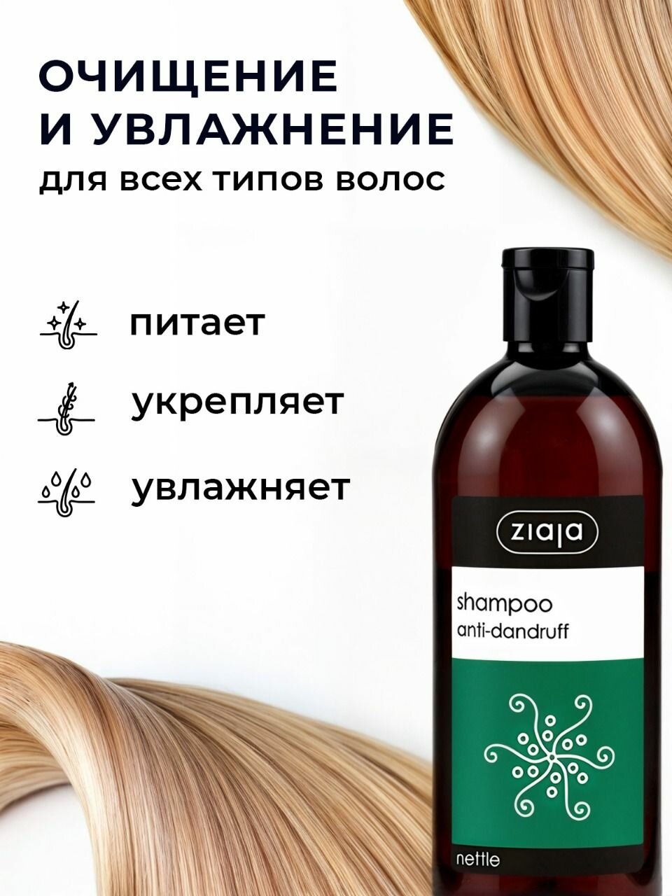 Шампунь для волос женский Ziaja 500 мл, против перхоти, для всех типов волос, с экстрактом крапивы, очищение и увлажнение интересное: