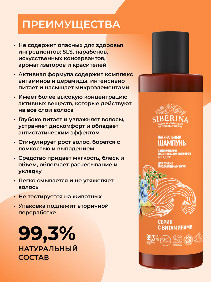 Купить Siberina Натуральный шампунь с церамидами и комплексом витаминов А, С, Е, F РР для тонких и ослабленных волос, 200 мл