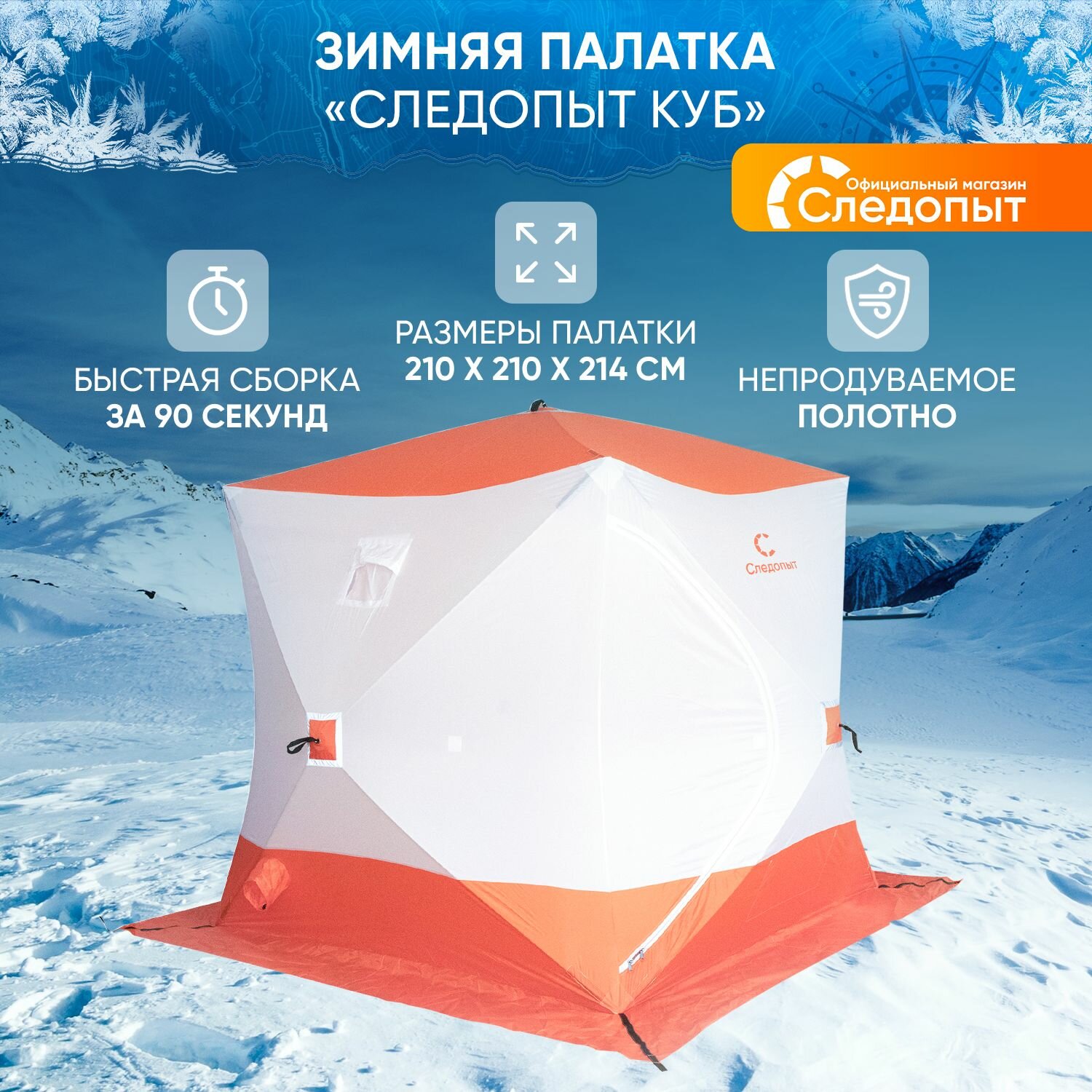 Палатка зимняя куб Следопыт, 2,1 х2,1 м, Oxford 210D PU 1000, 4-местная ,цвет бело-оранжевый 9316781 .