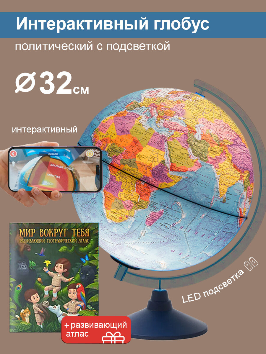 Интерактивный глобус Земли политический 32см, с подсветкой от батареек + Развивающий атлас "Мир вокруг тебя" + VR очки интересное: