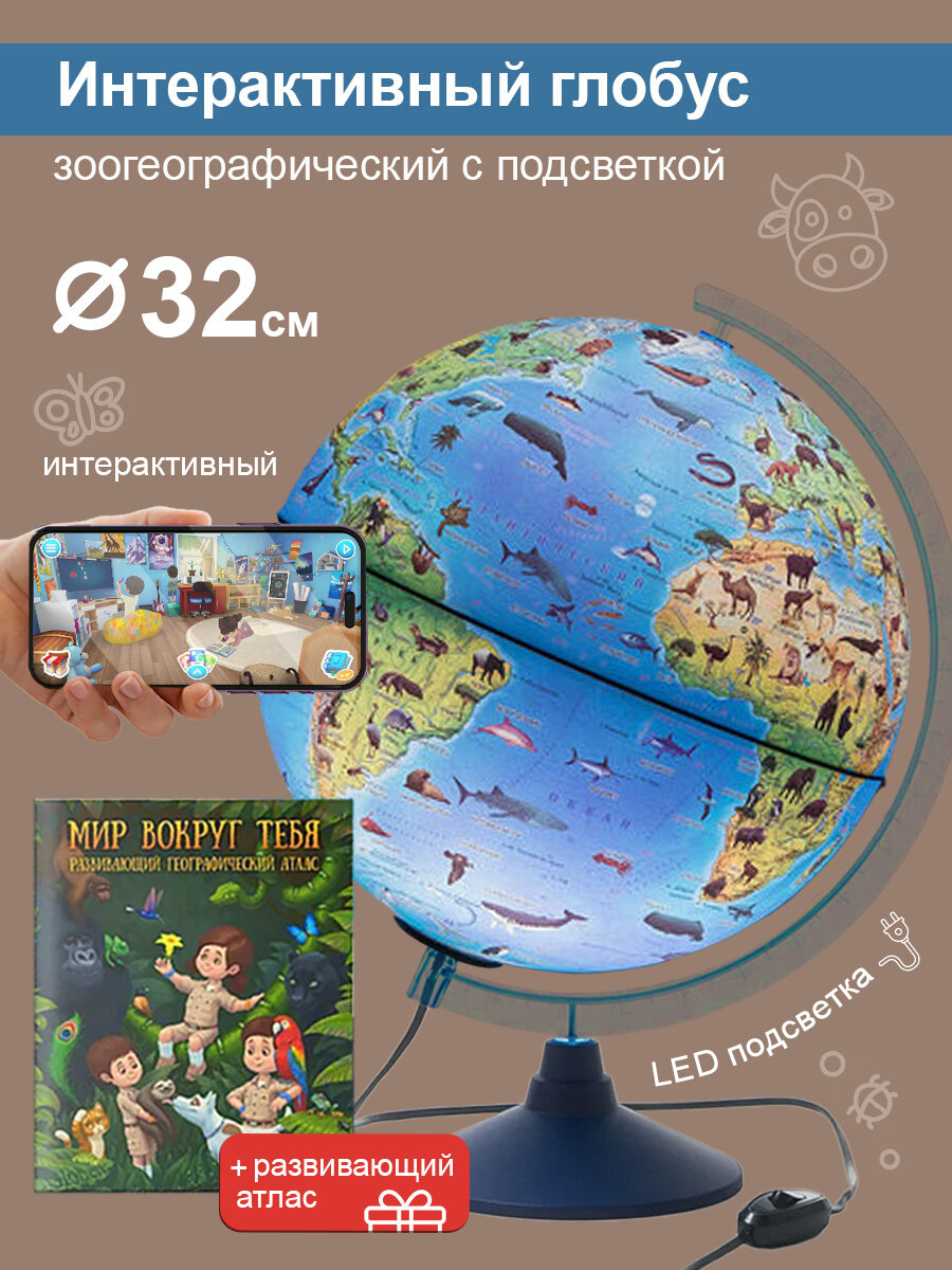 Интерактивный глобус Зоогеографический (Детский) 32 см, с LED-подсветкой + Атлас + VR очки интересное: