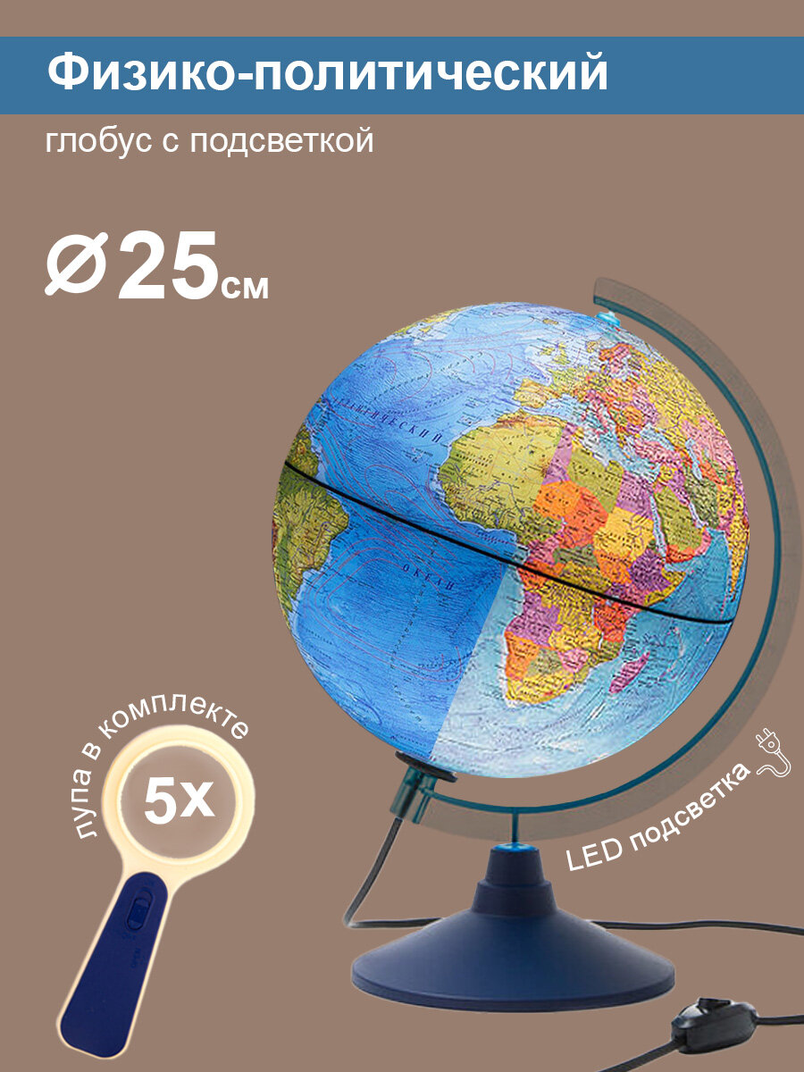 Глобус Земли Globen физический-политический, с LED-подсветкой, диаметр 25см. + лупа интересное: