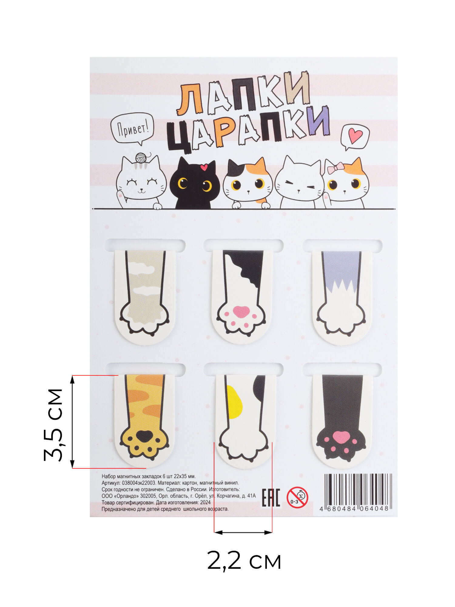 Набор магнитных закладок "Лапочки" (6шт 22х35мм), закладка для книг