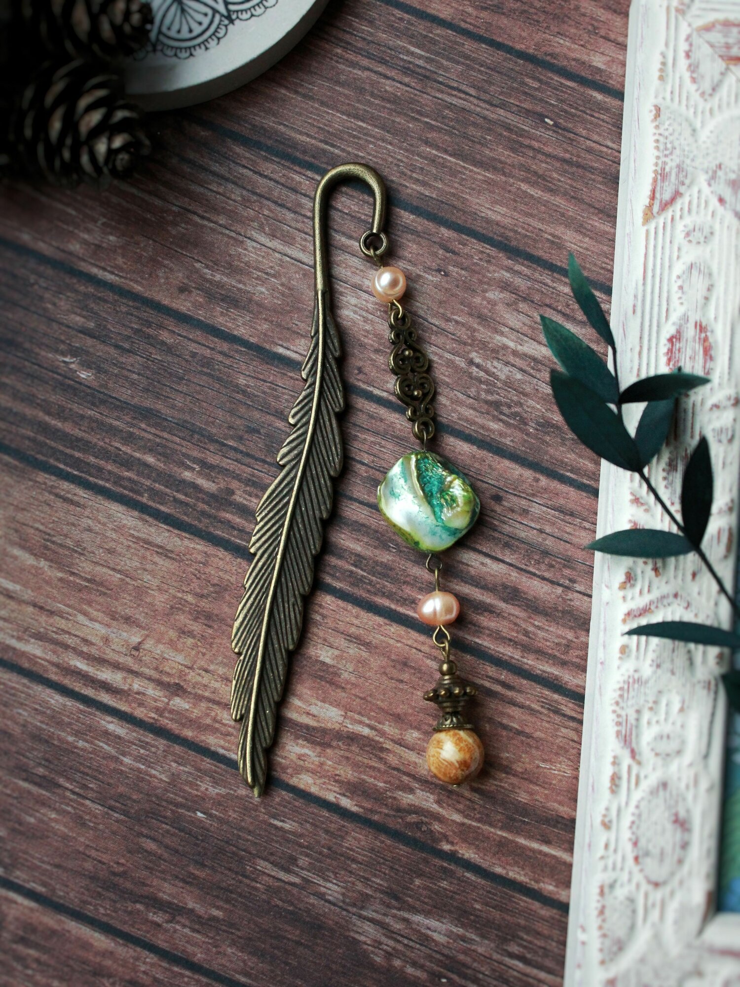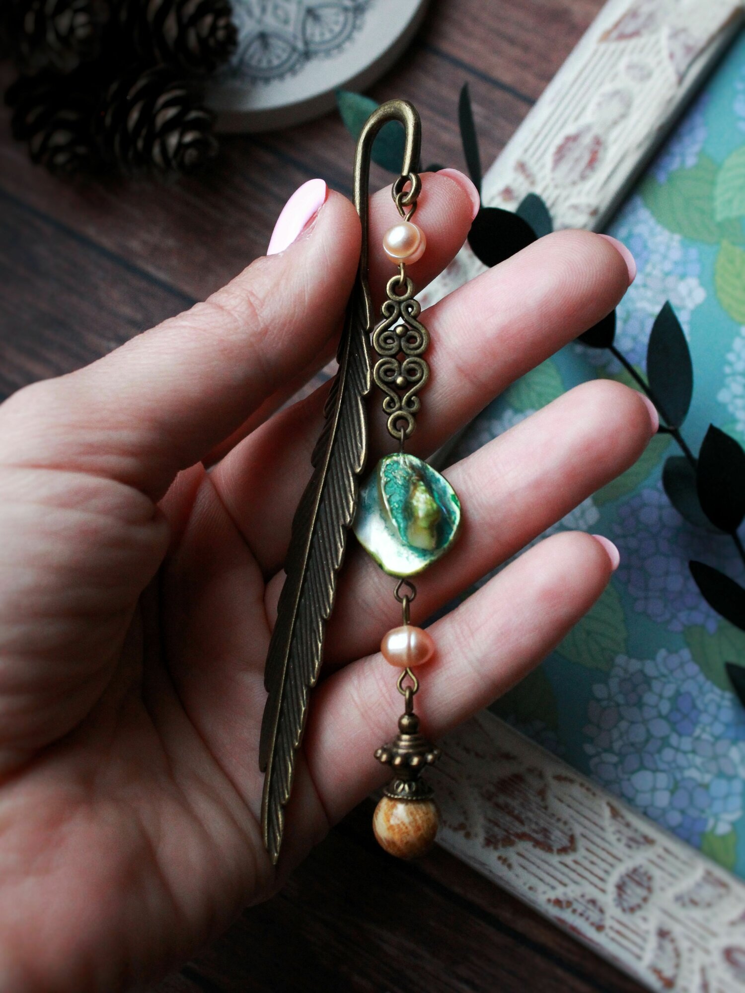 Закладка-перо "Забытая цивилизация" медная с художественной подвеской, для книги ежедневника дневника, натуральные минералы, готовый подарок