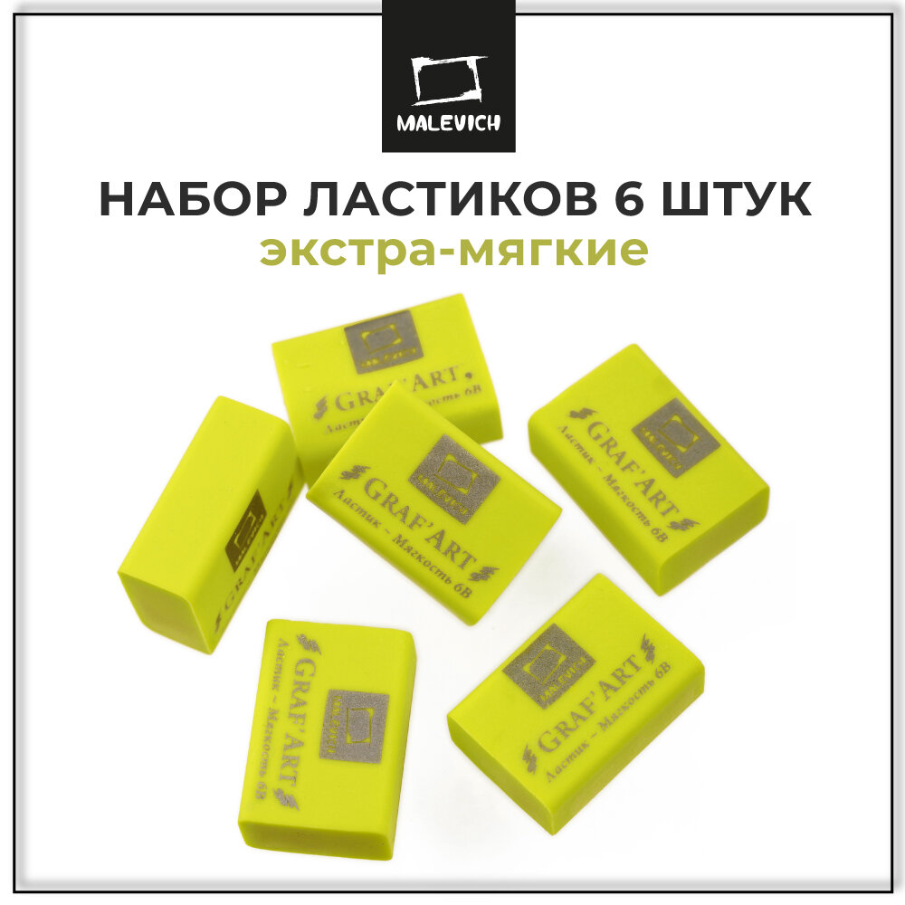 Ластик экстра мягкий 6В Малевичъ, белый, набор ластиков 6 шт