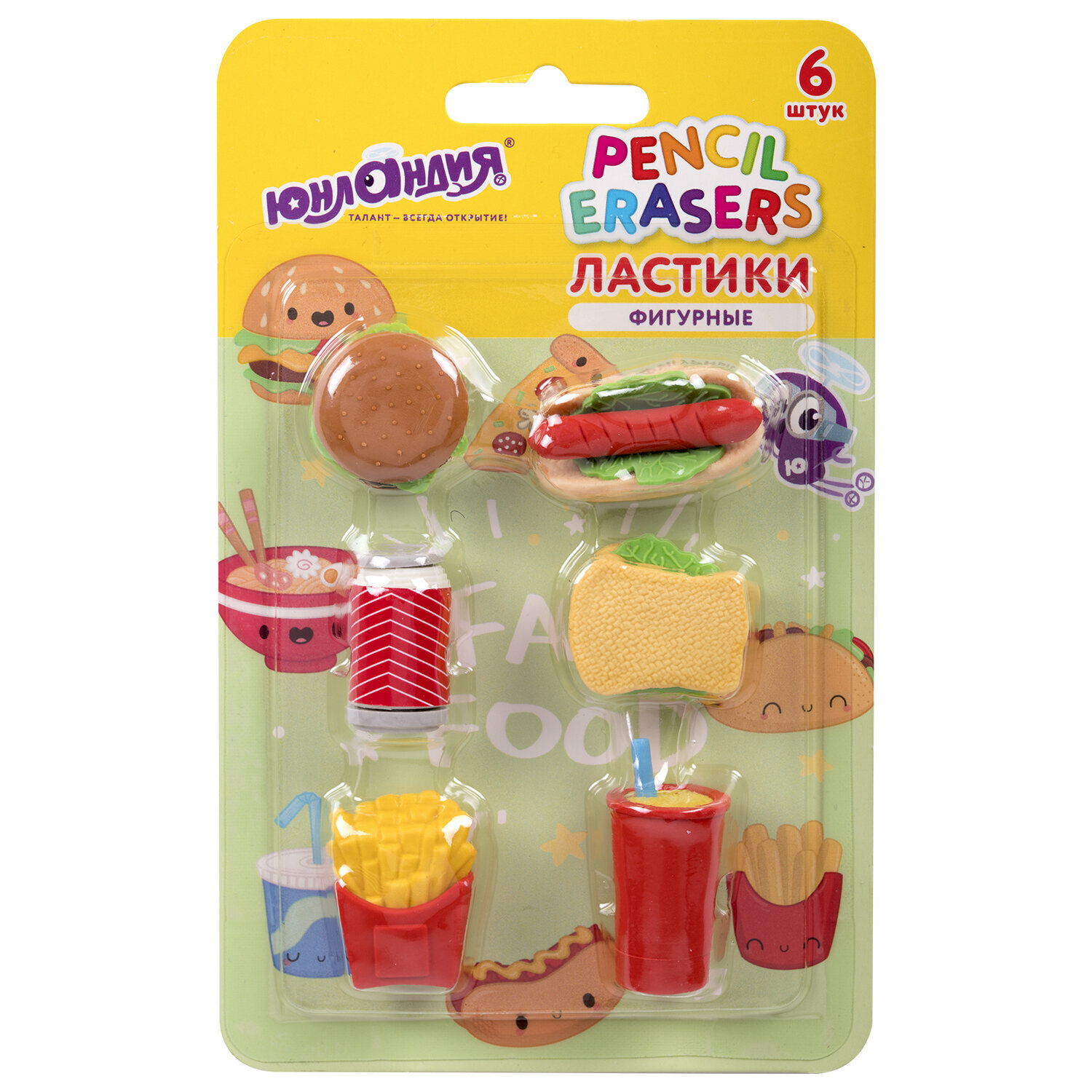 Ластик школьный фигурный набор 6 штук, стирательная резинка Фастфуд, стерка канцелярская для карандаша, Юнландия, 272670 интересное: