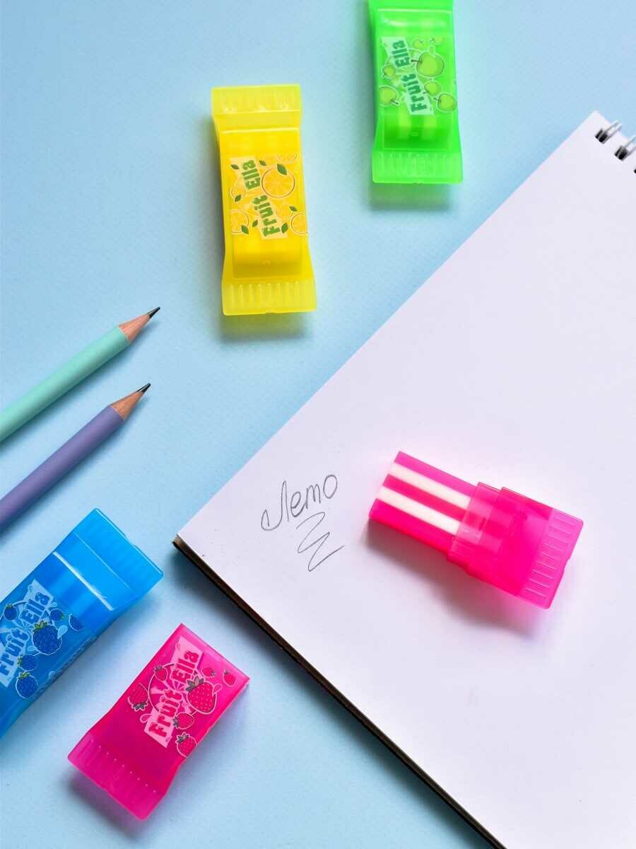 Купить Ластик, 64854 ФРУТЕЛЛА (ассорти, разноцветный, 78х26х16 мм, ПВХ, с пластиковым футляром-держателем), комплект из 2 штук