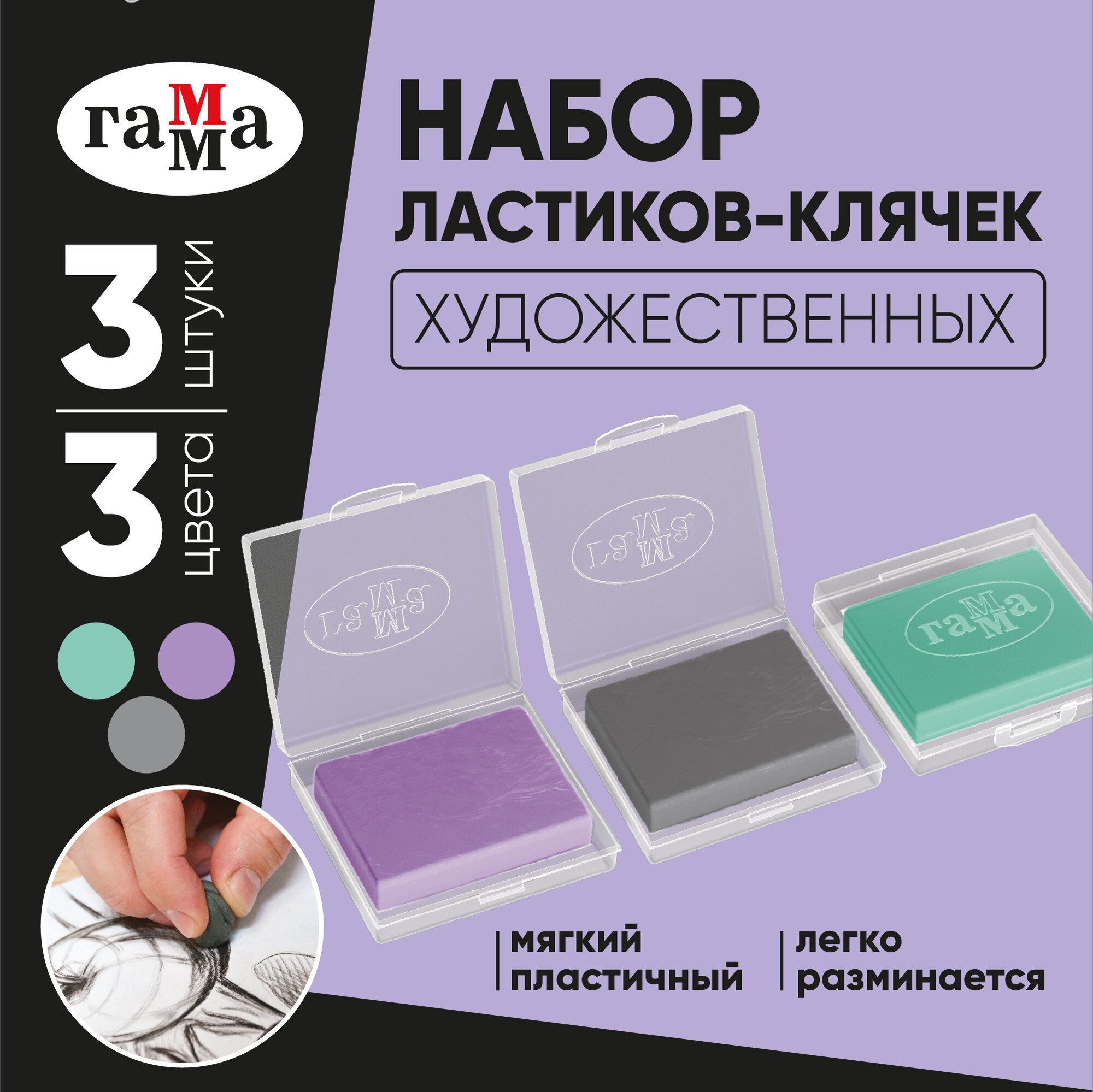 Купить Ластик-клячка Гамма "Студия", 40*35*10мм, серый, зеленый, фиолетовый, 3шт, пластик. контейнер, карт. упак.