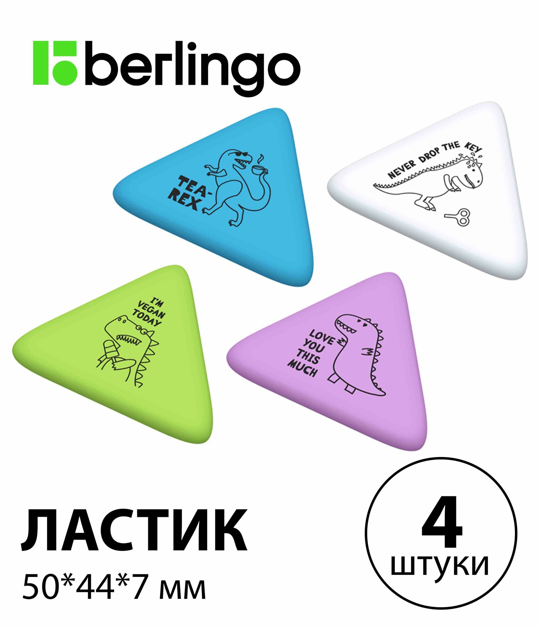 Купить Набор 4 шт. - Ластик Berlingo "Dino", треугольный, термопластичная резина, 50*44*7 мм BLc_00690