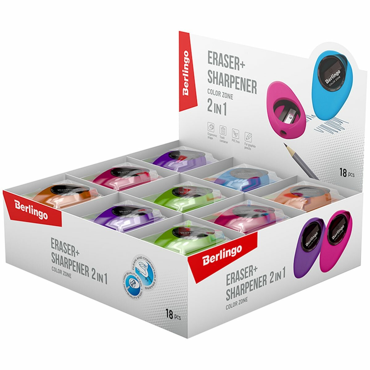Точилка ручная пластиковая с ластиком Berlingo Color Zone (1 отверстие, с контейнером, разные виды) (BLc_00570), 1шт. интересное: