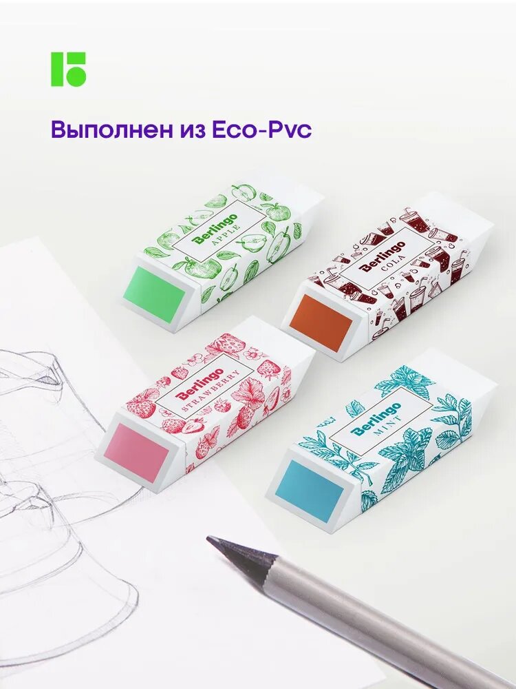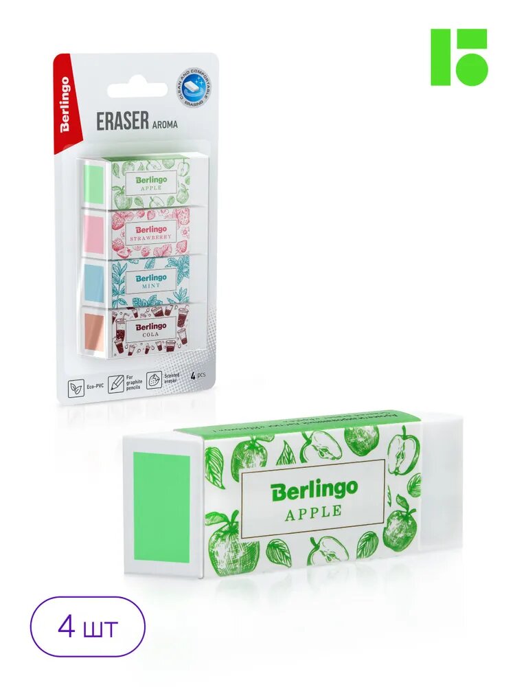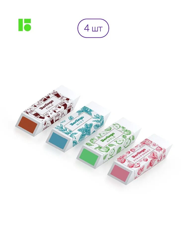 Купить Ластики для школы Berlingo Aroma стирательная резинка канцелярская, стерка для карандаша с запахом, набор 4 шт, 58х22х20 мм