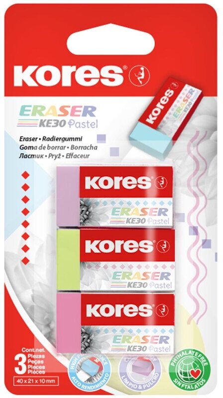 Купить Ластик Kores 40x21x10мм 3 шт/уп, пастельный KE-30, блистер 40315