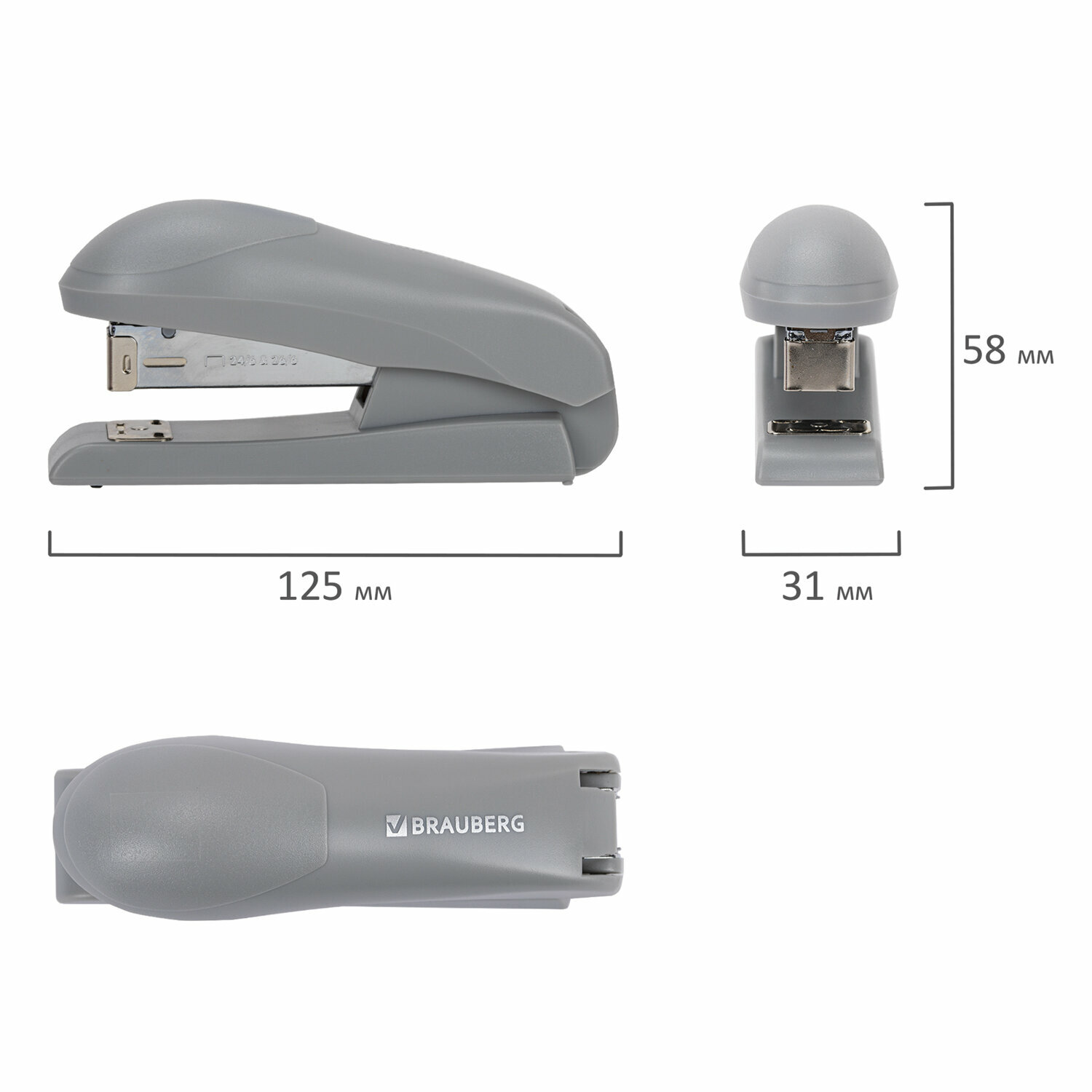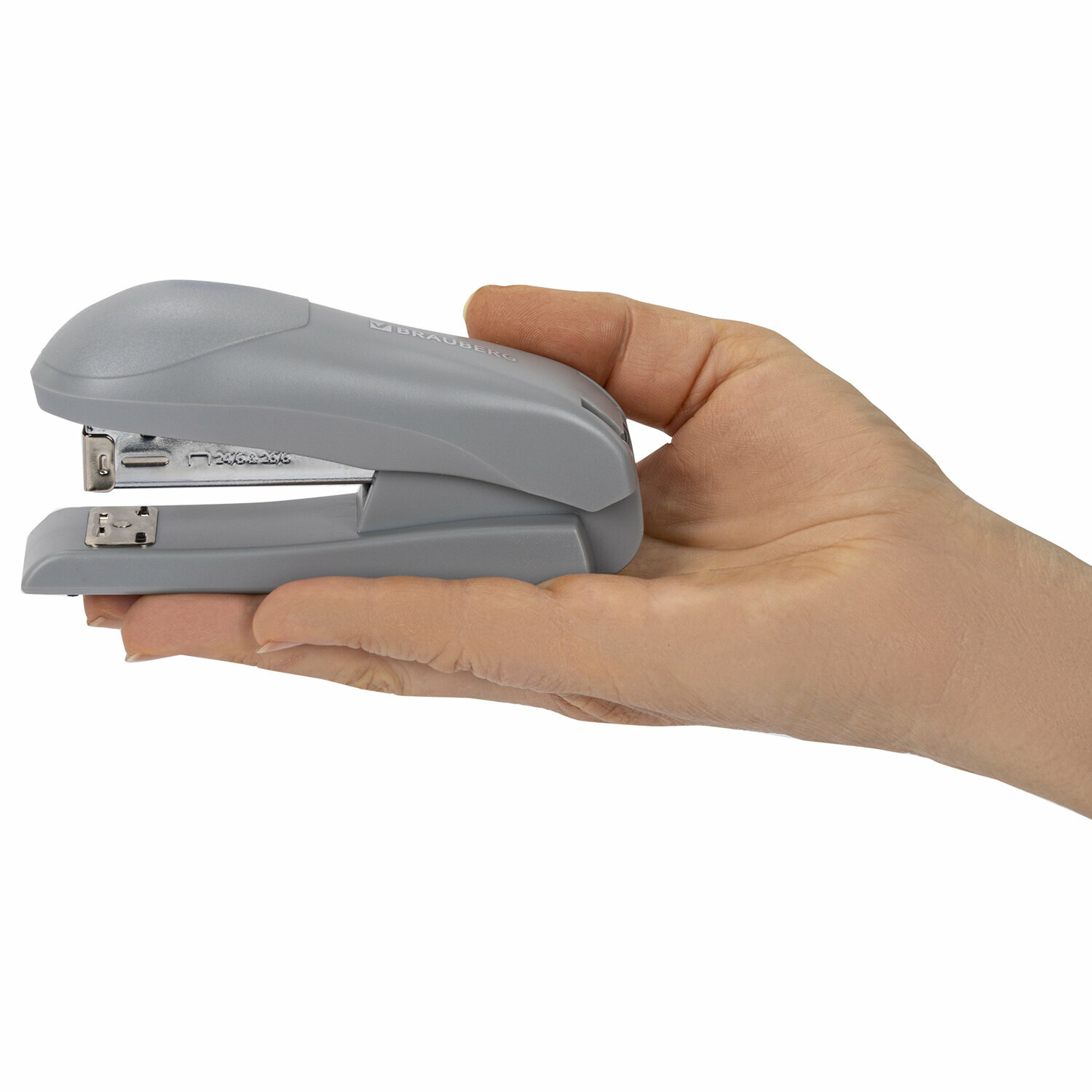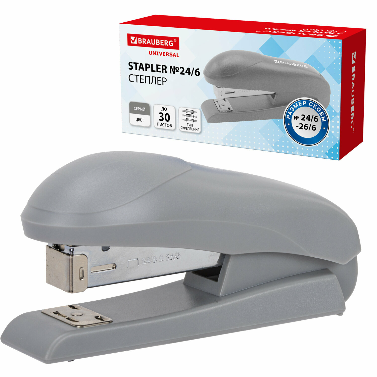 Купить Степлер канцелярский маленький для бумаги №24/6 26/6, до 30 листов, на 100 скоб, серый, Brauberg Universal, 272717