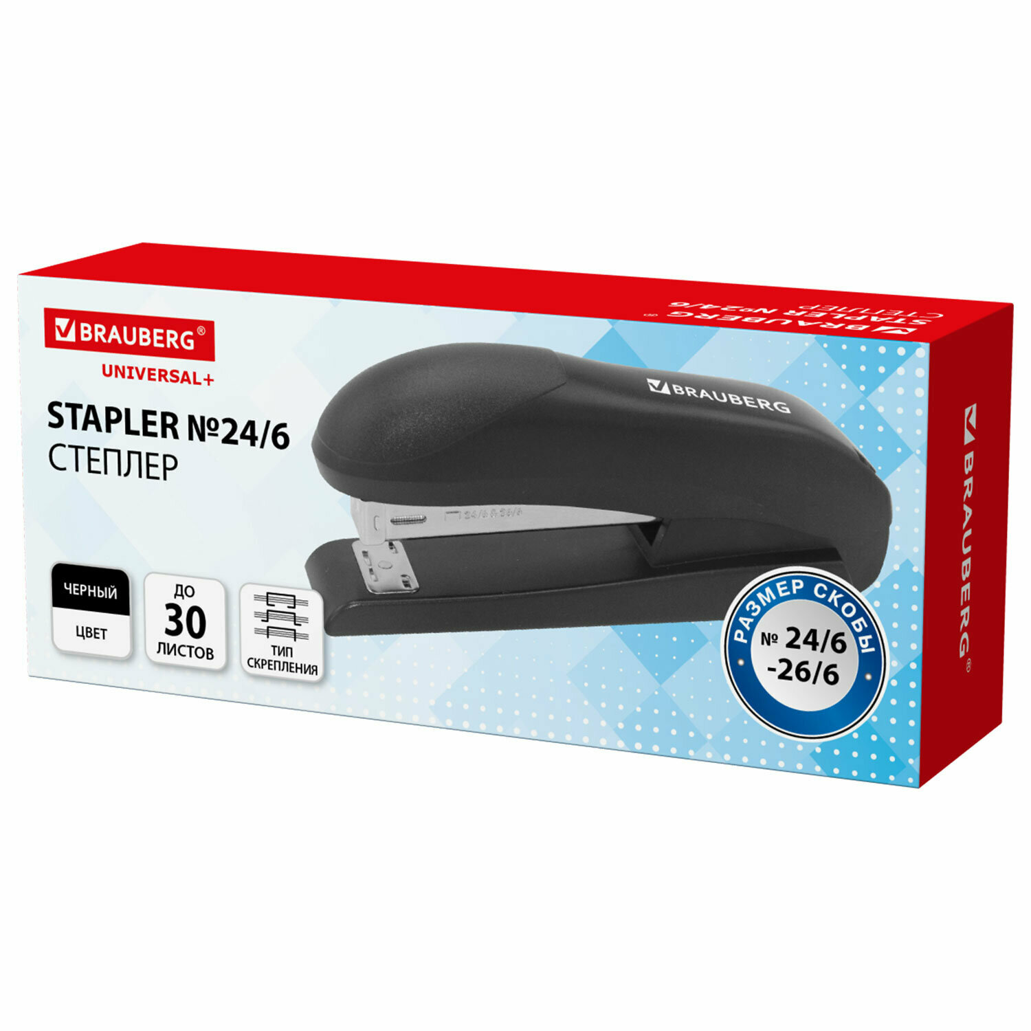 Купить Степлер канцелярский маленький для бумаги №24/6 26/6, до 30 листов, полнозагрузочный на 150 скоб, черный, Brauberg Universal+, 272719
