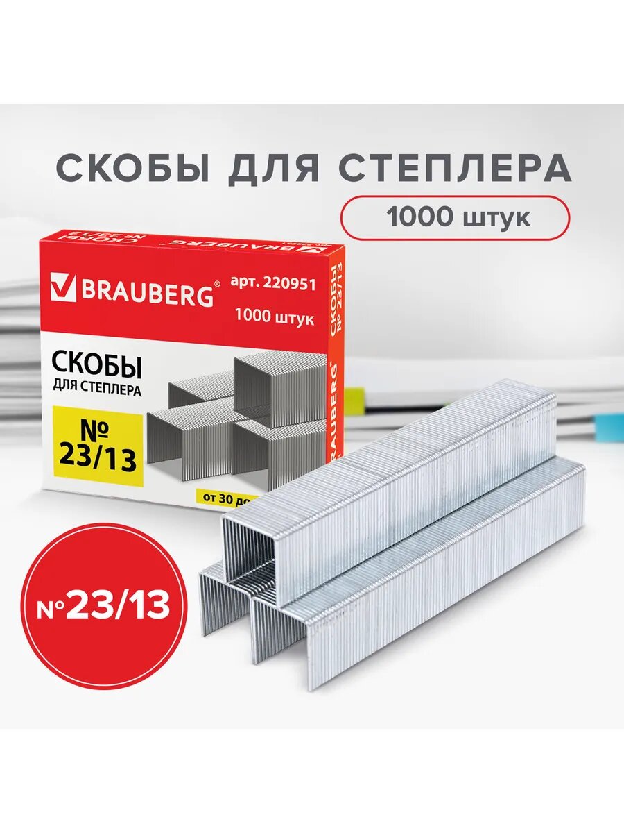 Скобы для канцелярского степлера №23/13, набор 1000 штук, Brauberg, от 30 до 80 листов, 220951