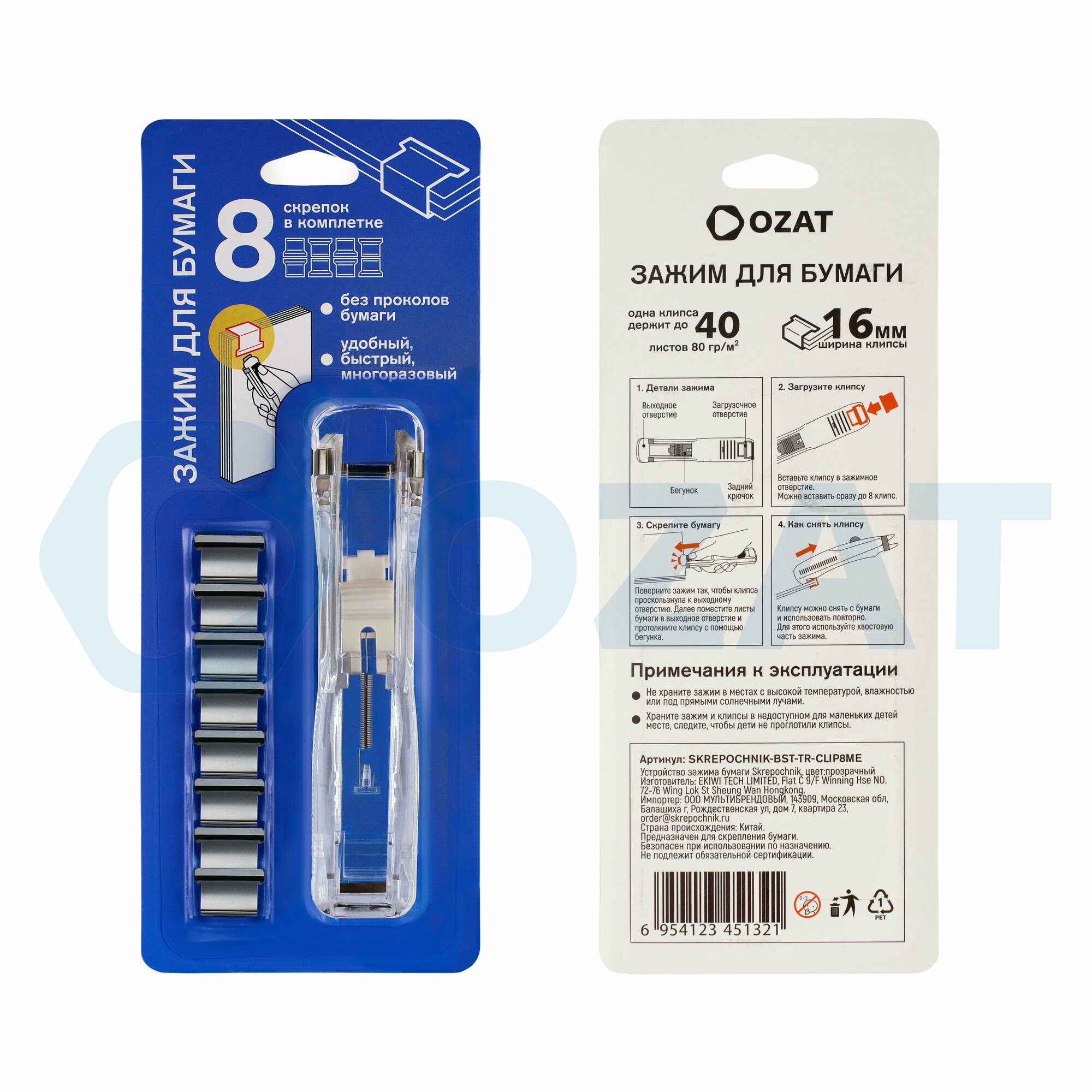 Купить Устройство скрепления бумаги (степлер) Skrepochnik, прозрачное + 8 зажимов (клипс)