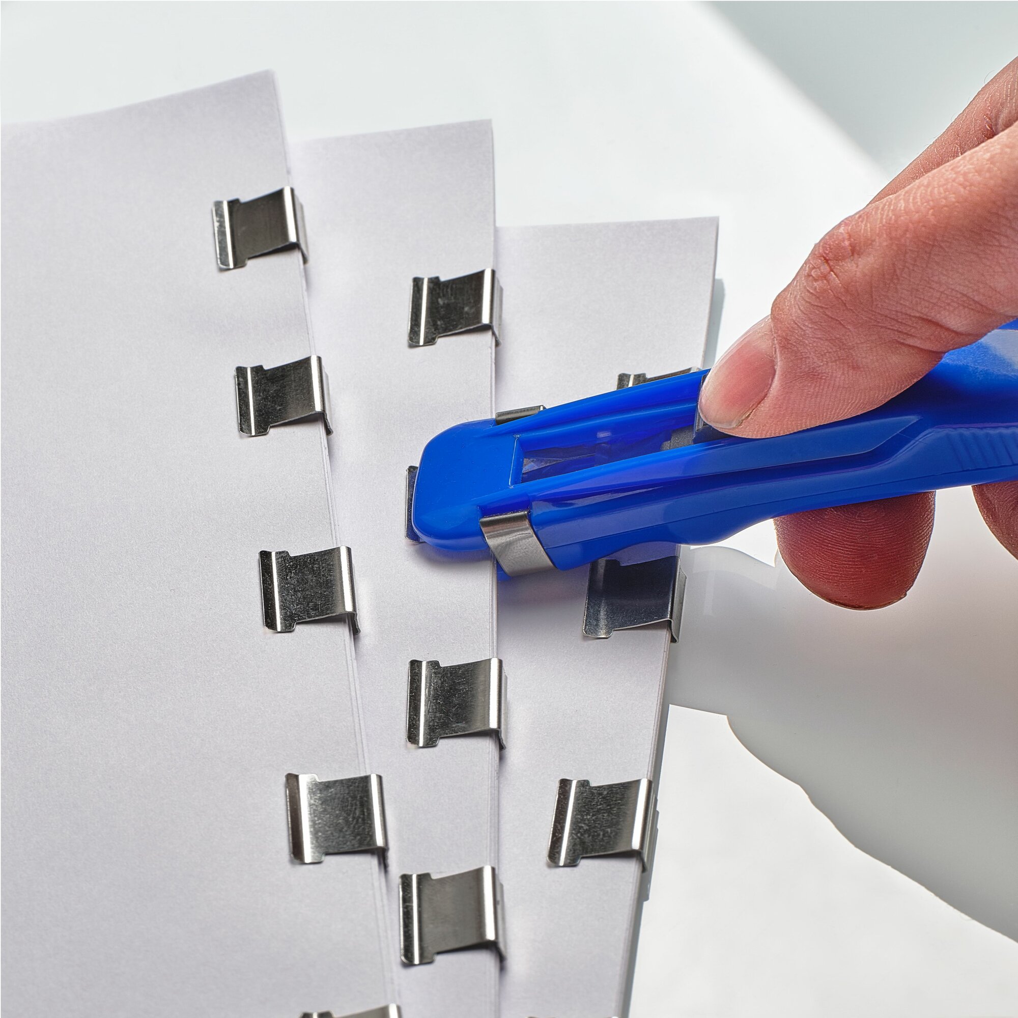 Купить Устройство скрепления бумаги (степлер) Skrepochnik, синее + 8 зажимов (клипс)