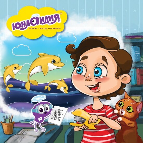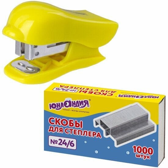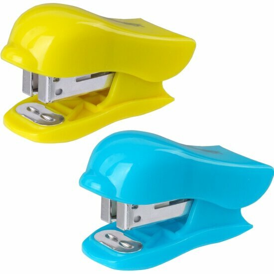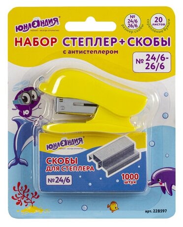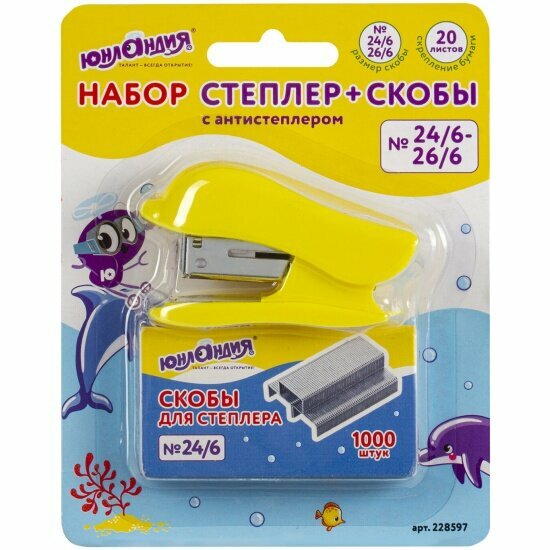 Степлер Юнландия №24/6, 26/6 мини "Дельфин", до 20 листов + скобы 24/6 1000 шт, ассорти, блистер интересное: