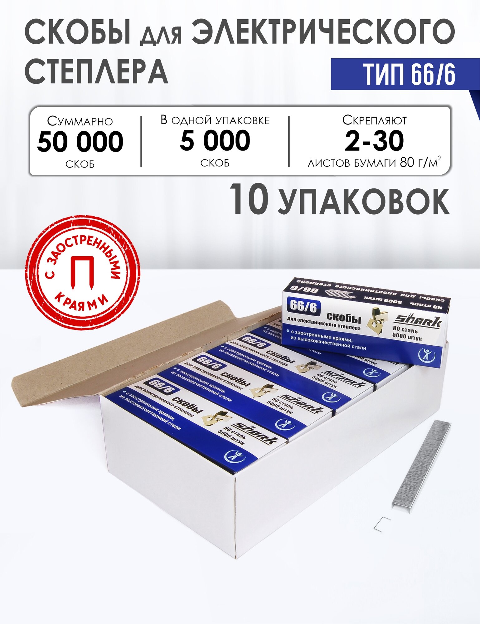 Купить Скобы для электрического степлера 66/6 с заостренными краями, 10 пачек по 5000 шт, Shark, до 30 листов бумаги