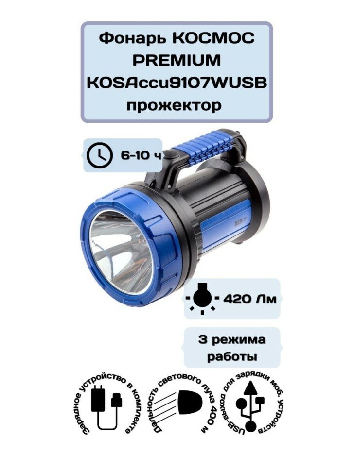 Космос фонарь-прожектор 9107WUSB (акк.4V4Ah) LED 7W(420lm), син./пластик, USB выход, з/у 220/12в KOSACCU9107WUSB