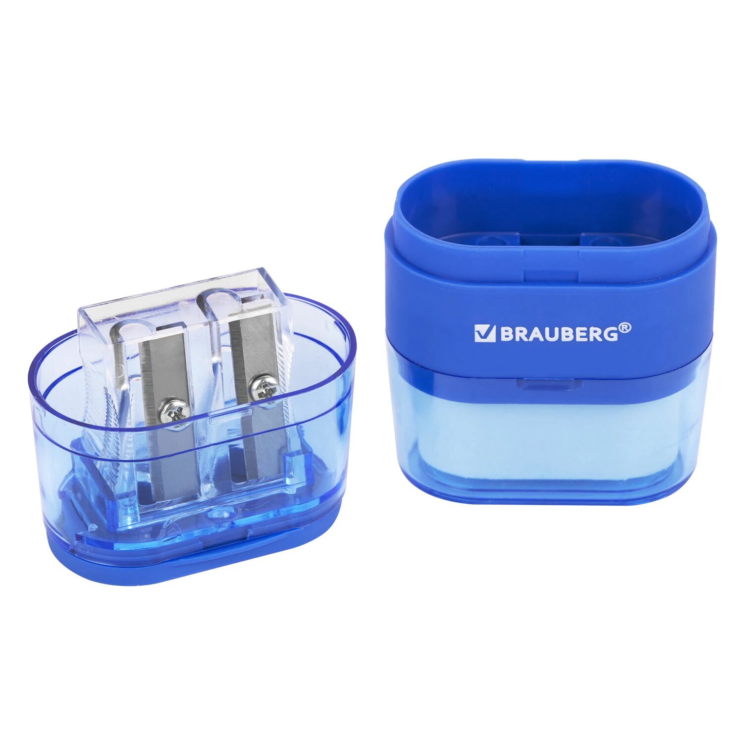 Купить Точилка для простых и цветных карандашей с ластиком, набор 2 штуки в школу, 2 отверстия, с контейнером, синяя зеленая, Brauberg Double, 271995