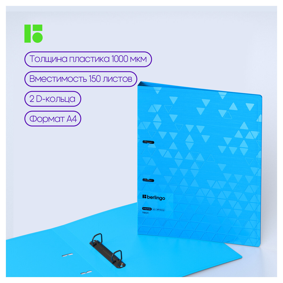 Папка на 2 кольцах Berlingo "Neon", 24мм, 1000мкм, голубой неон, D-кольца, с внутр. карманом