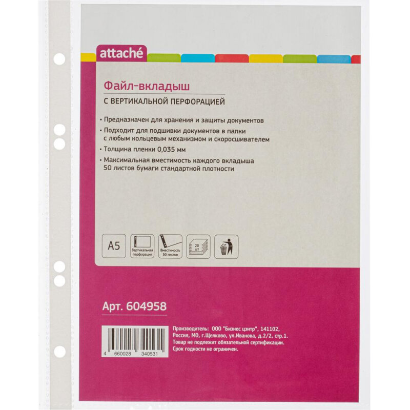 Купить Файлы А5, гладкие, Attache, с перфорацией, 35 мкм, 20 шт