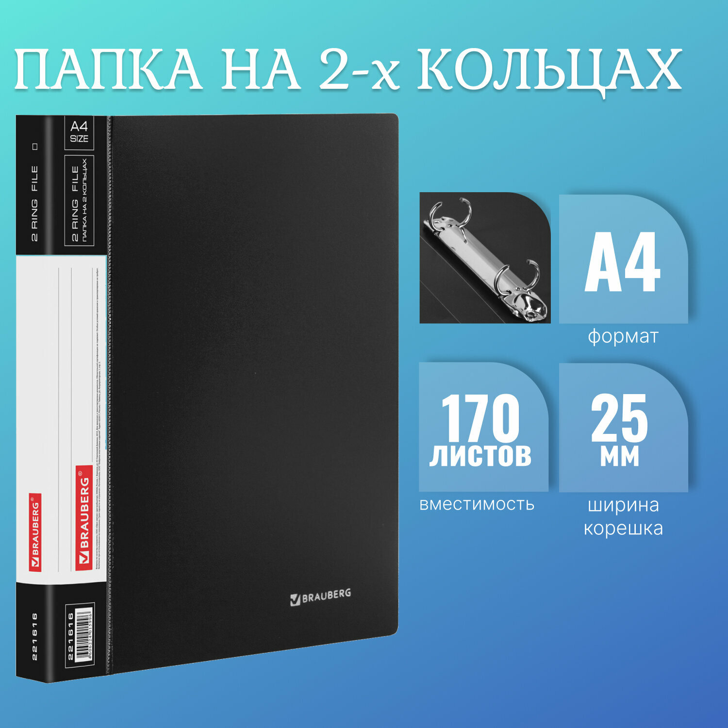 Купить Папка для документов и бумаг на 2 кольцах канцелярская Brauberg Стандарт, 25 мм, черная, до 170 листов, 0,8 мм, 221616