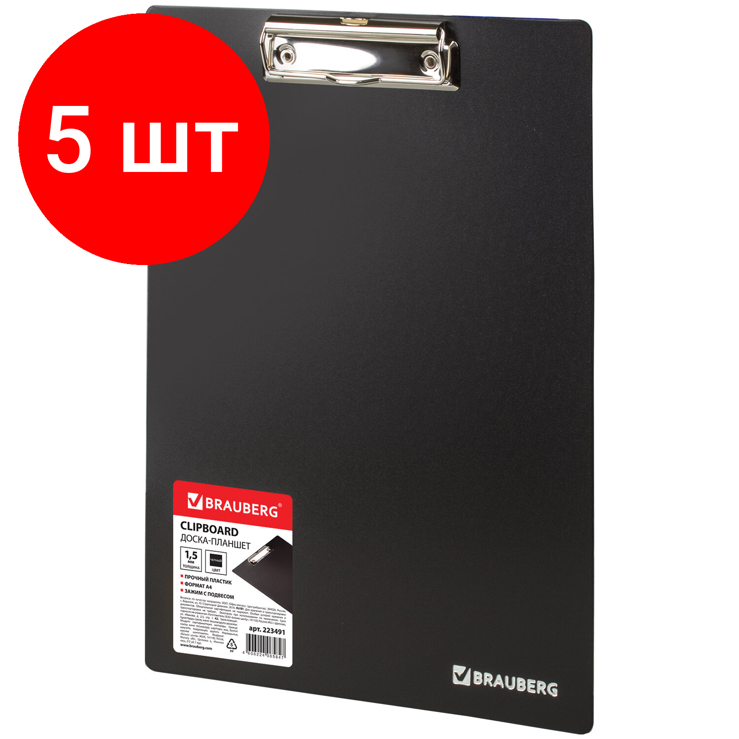 Купить Комплект 5 шт, Доска-планшет BRAUBERG Contract сверхпрочная с прижимом А4 (313х225 мм), пластик, 1.5 мм, черная, 223491