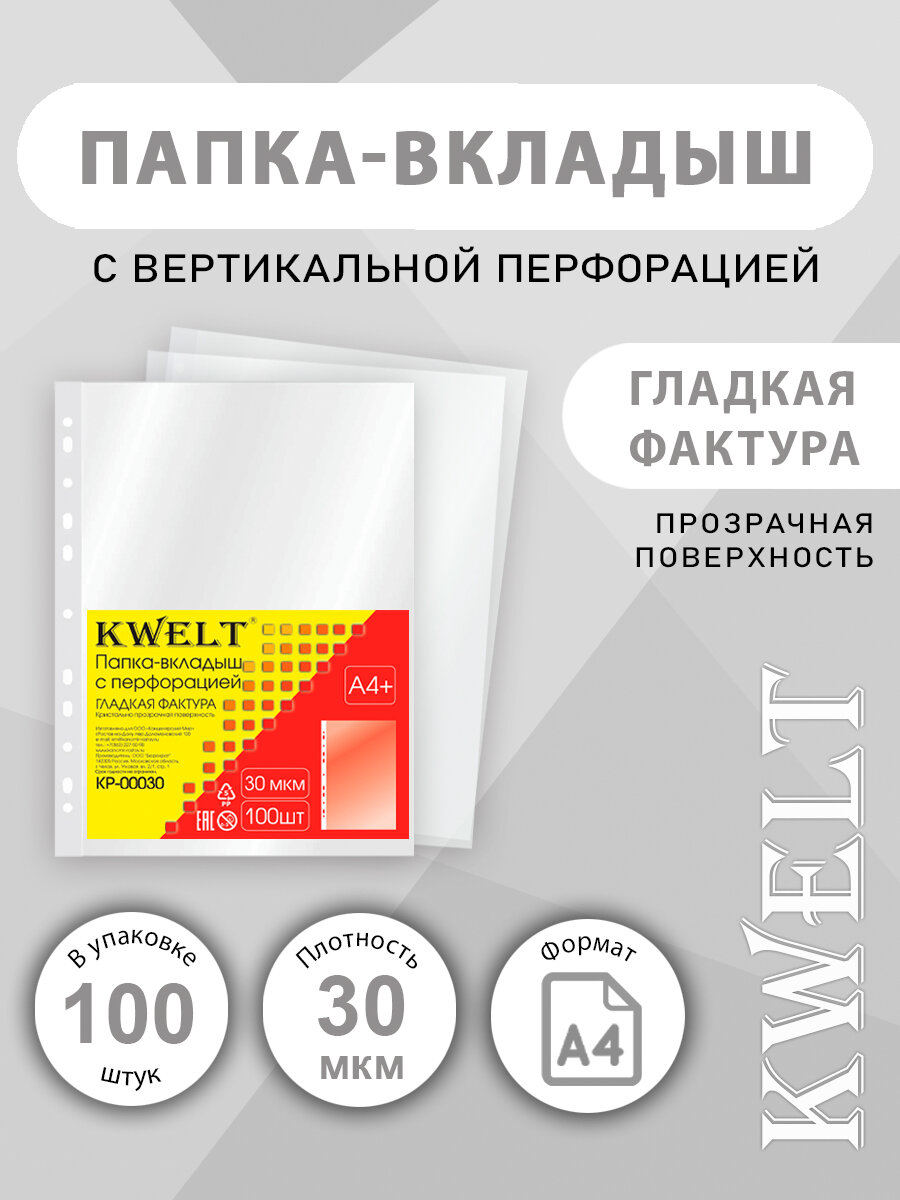 Купить Файлы А4+ для документов " KWELT " 30 мкм, 100 шт, глянцевые