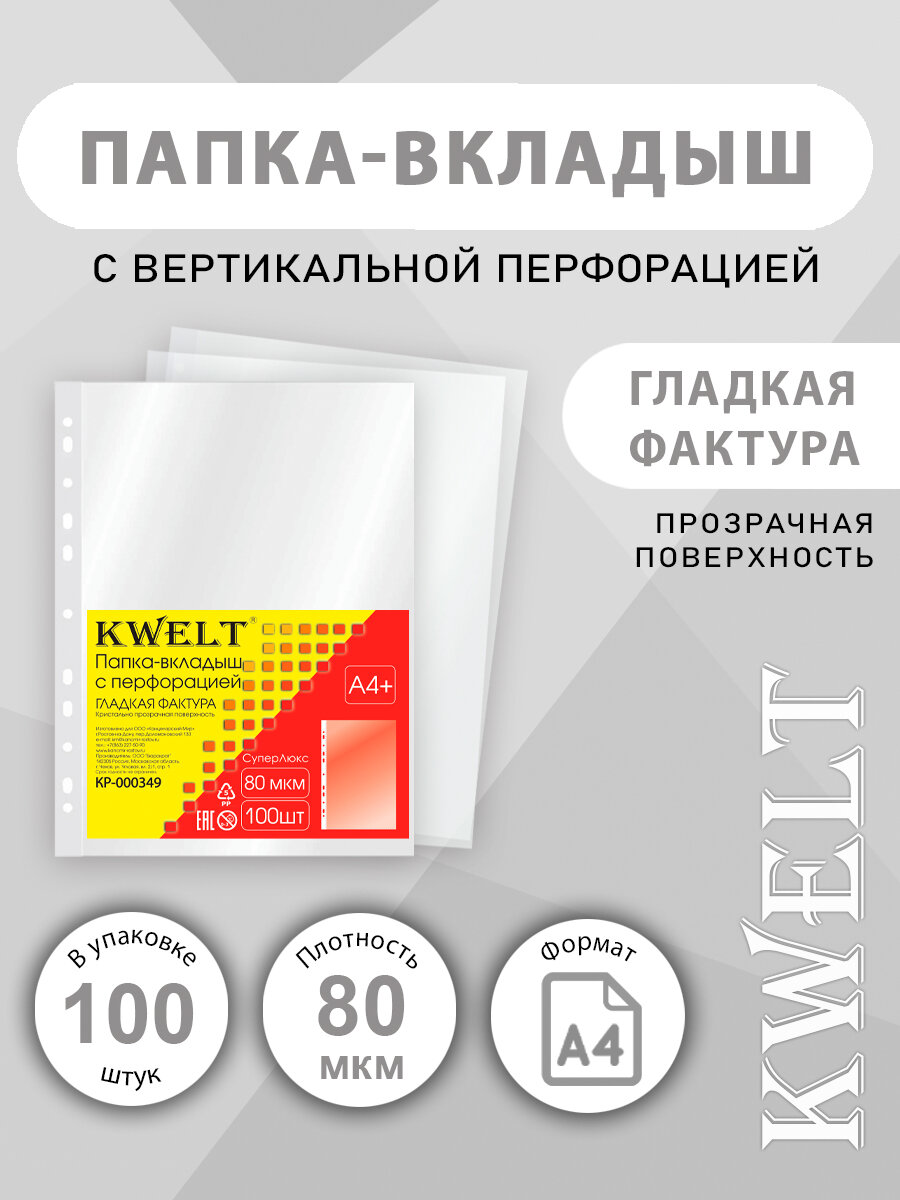 Купить Файлы А4+ для документов " KWELT " 80 мкм, 100 шт, глянцевые