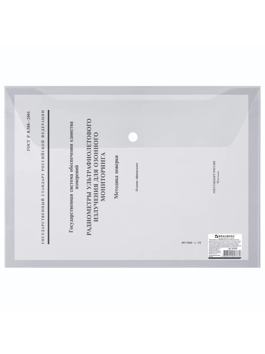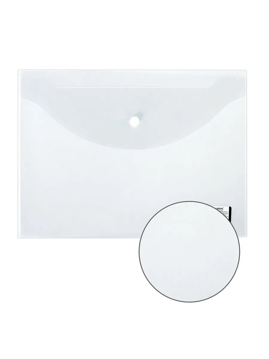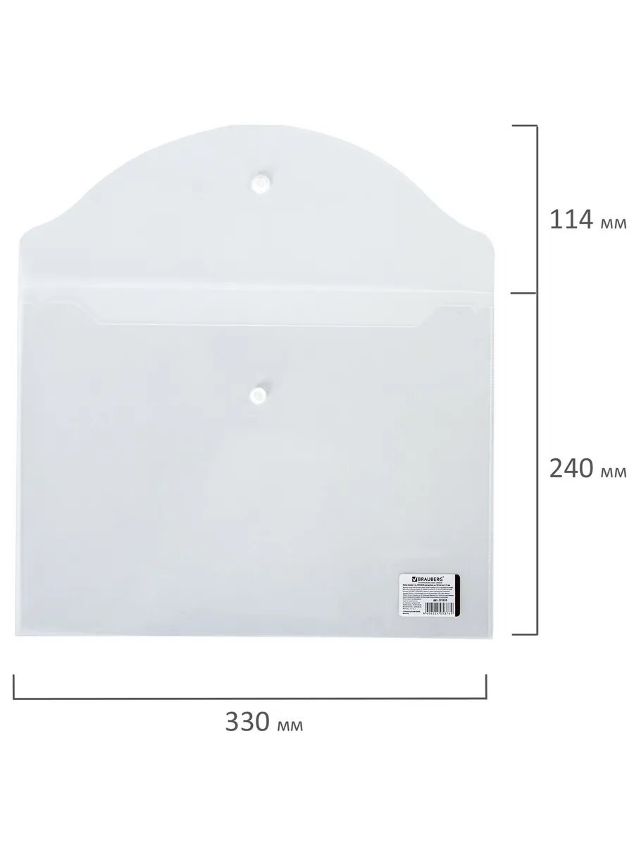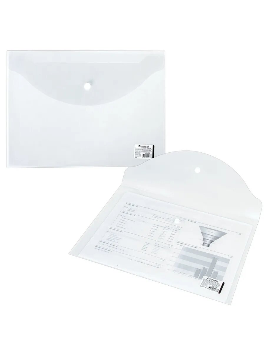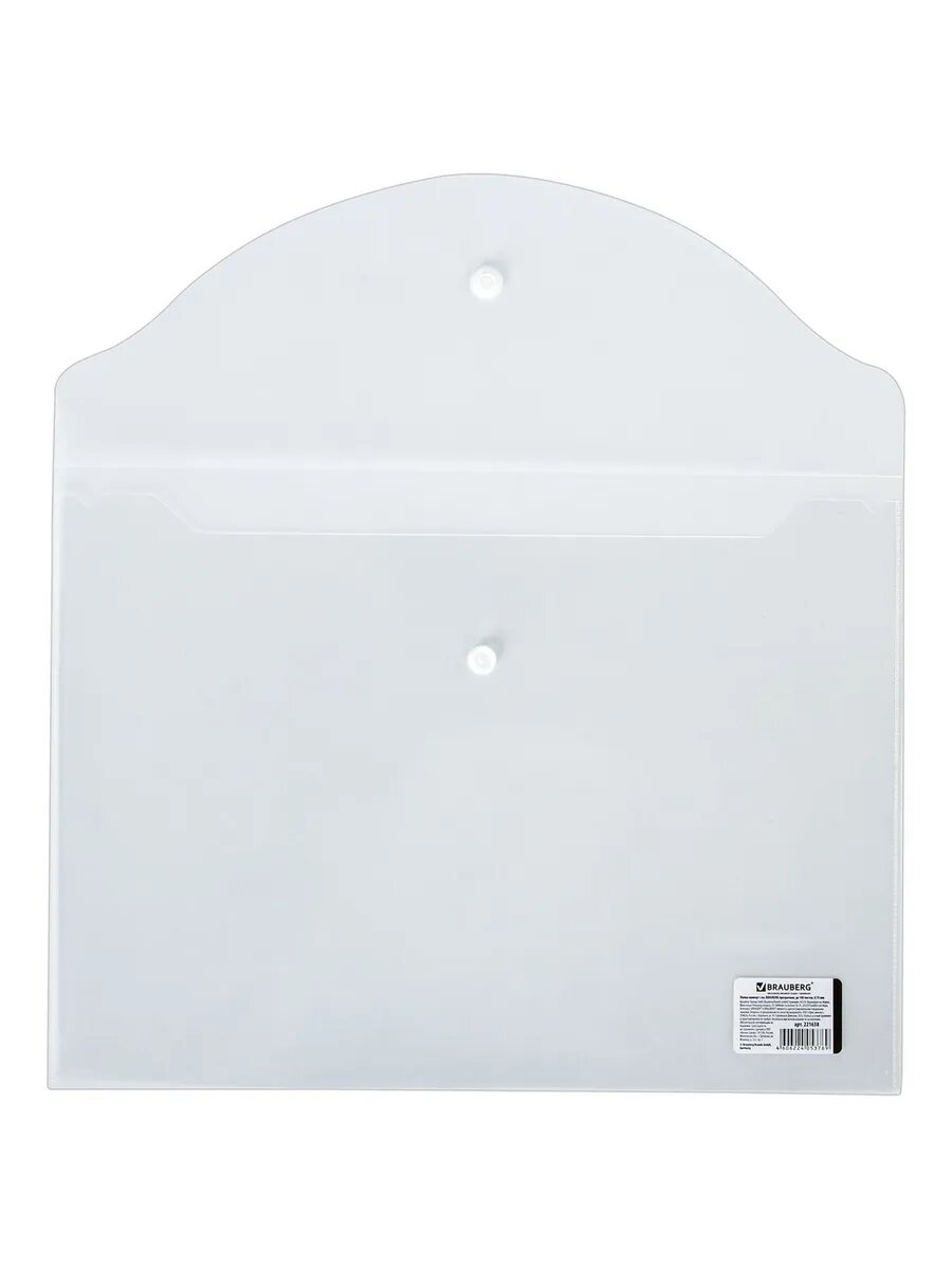 Папка-конверт с кнопкой BRAUBERG, А4, до 100 листов, прозрачная, 0,15 мм, 221638