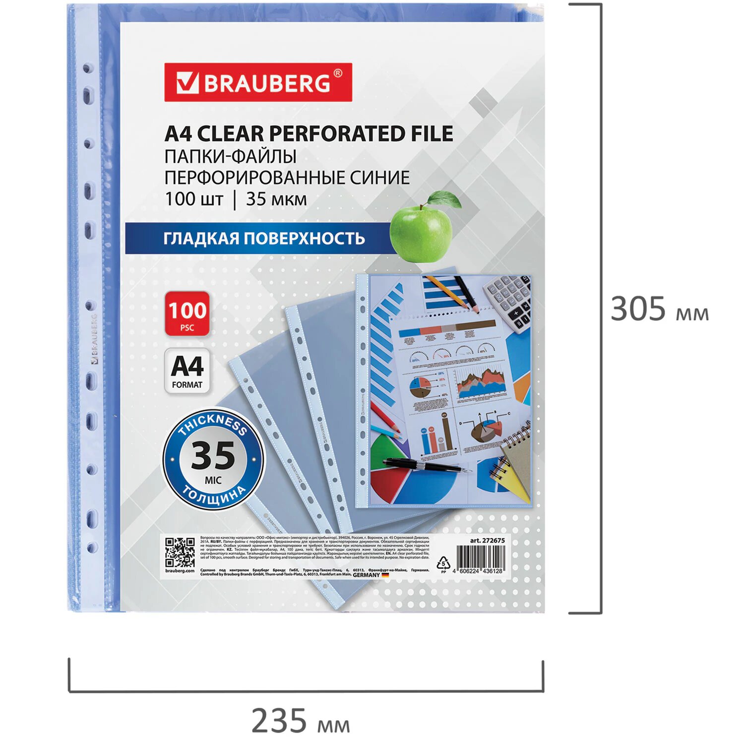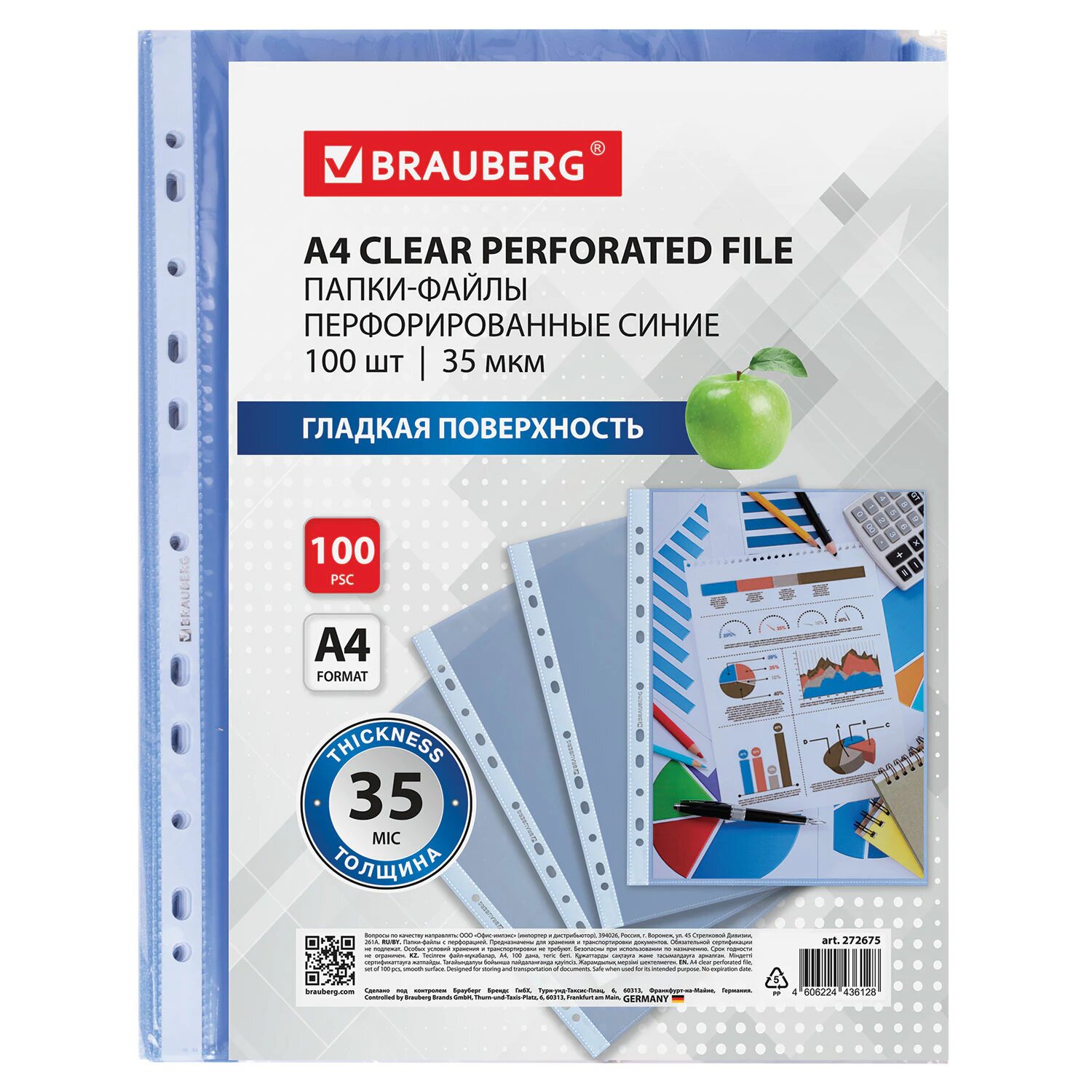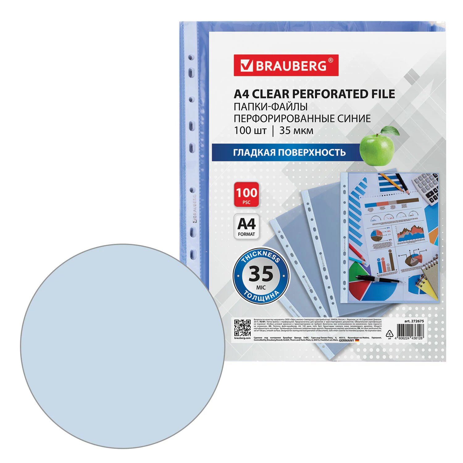 Файлы А4 100 штук перфорированные гладкие, вкладыши в папки для документов и бумаг, мультифора, 35 мкм, синие, Brauberg, 272675 интересное: