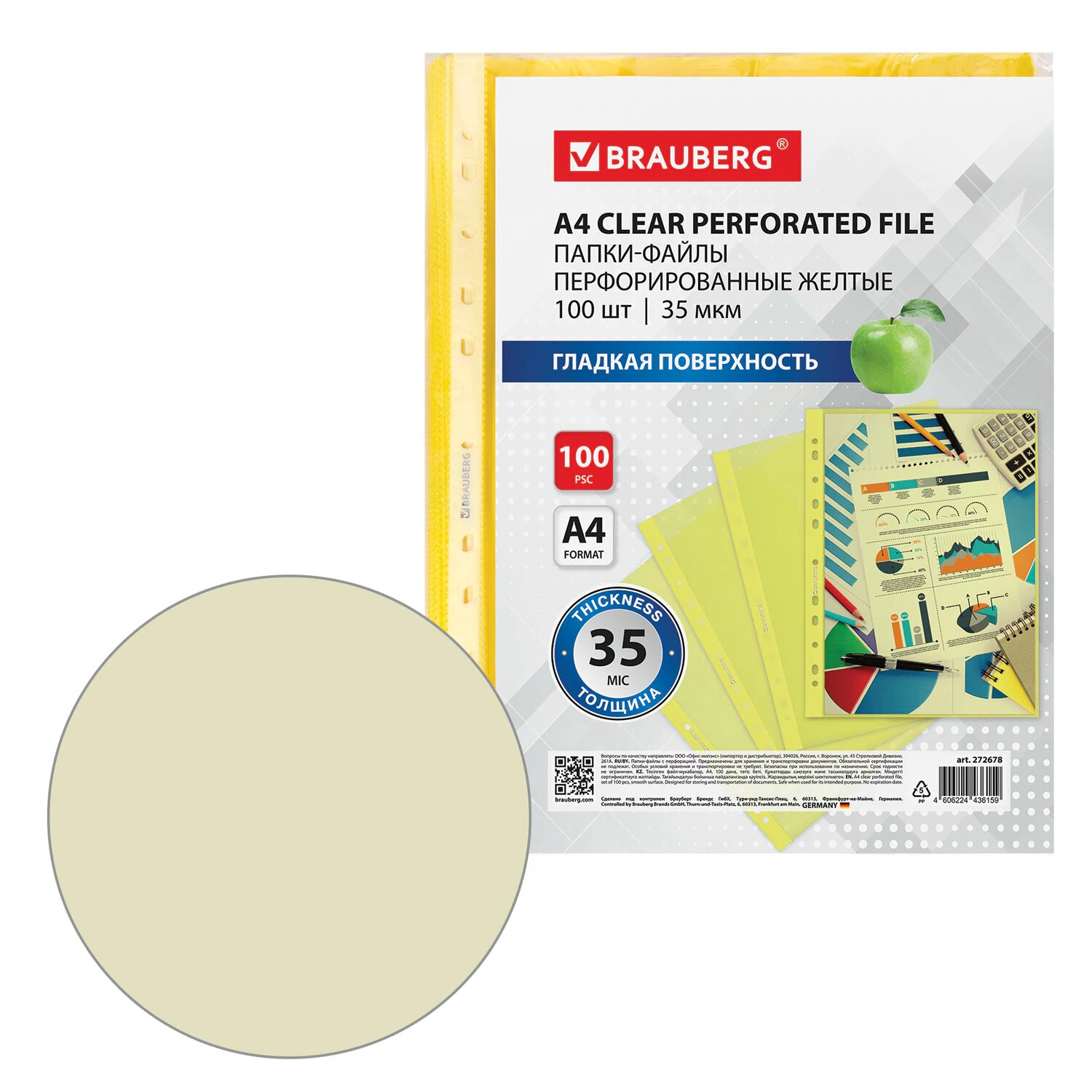 Файлы А4 100 штук перфорированные гладкие, вкладыши в папки для документов и бумаг, мультифора, 35 мкм, желтые, Brauberg, 272678 интересное: