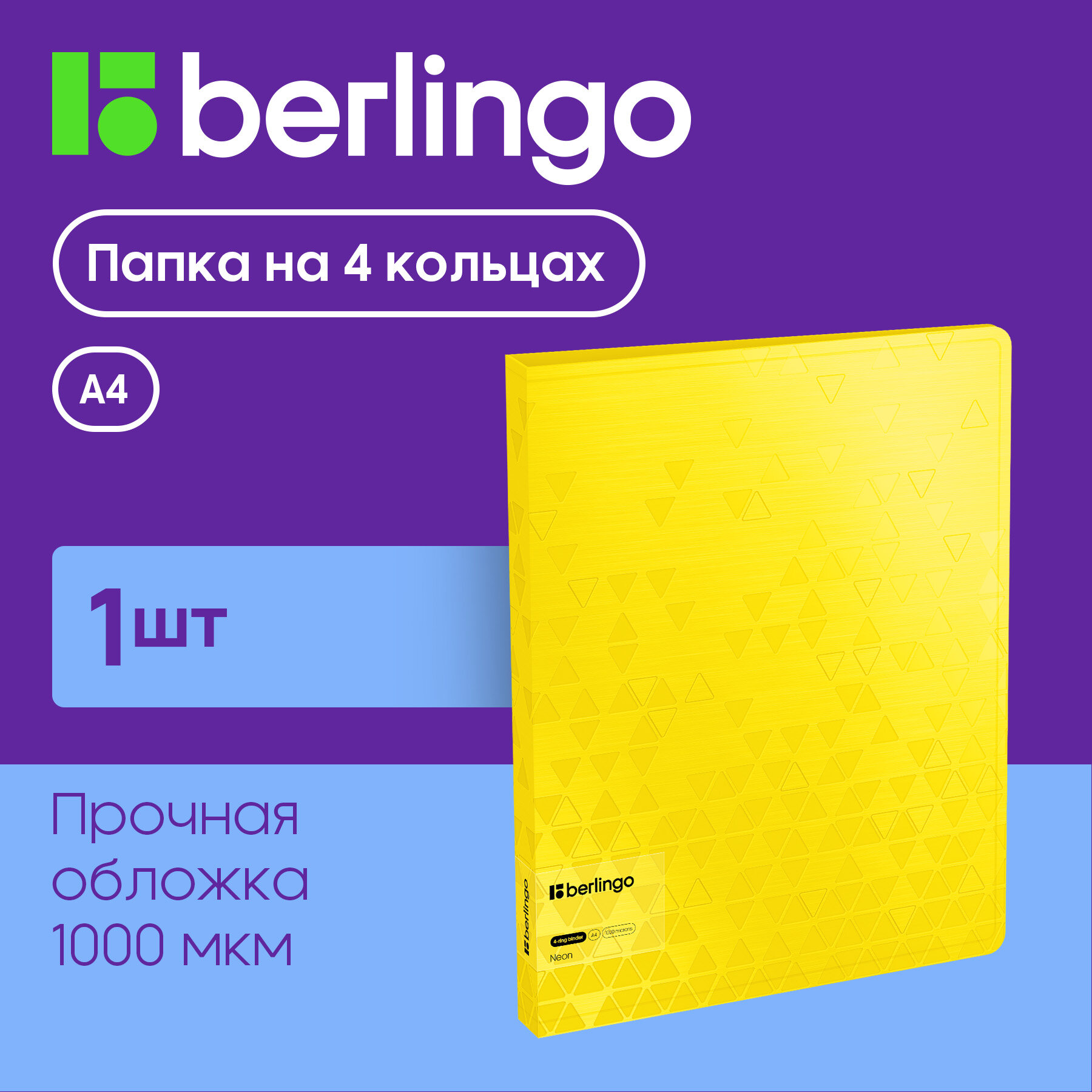 Купить Папка на 4 кольцах Berlingo "Neon", 24мм, 1000мкм, желтый неон, D-кольца, с внутр. карманом