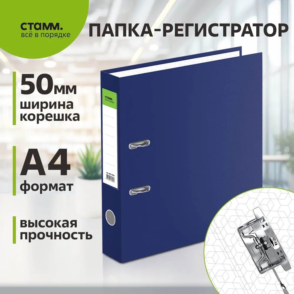 Купить Папка-регистратор СТАММ "Стандарт", 50мм, бумвинил, с карманом на корешке, синяя