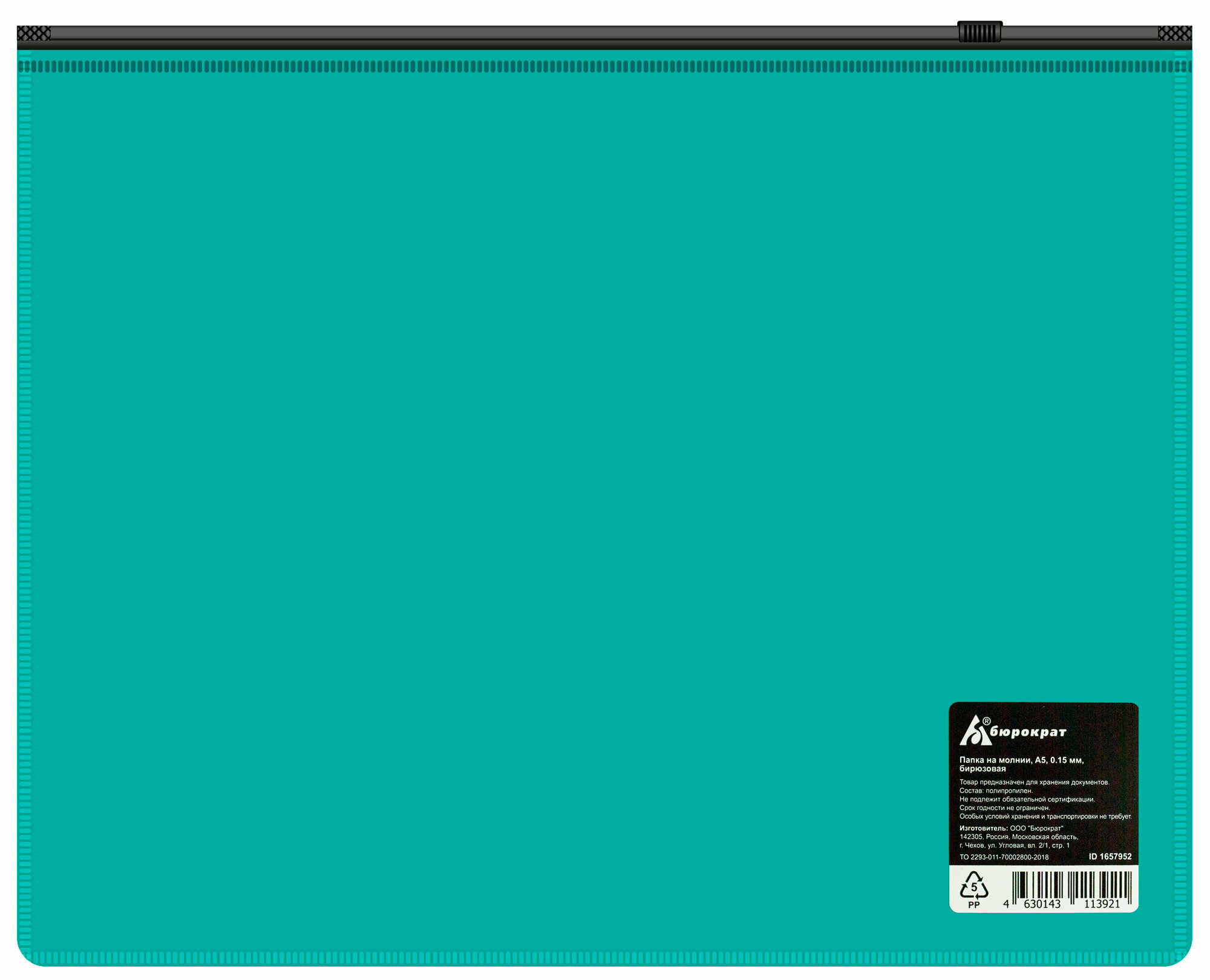 Папка на молнии ZIP Бюрократ -BPM5ATURGBL A5 полипропилен 0.15мм бирюзовый цвет молнии черный интересное: