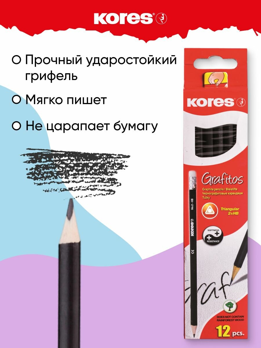 Карандаши простые с ластиком Kores, чернографитные, НВ, набор 12 шт интересное: